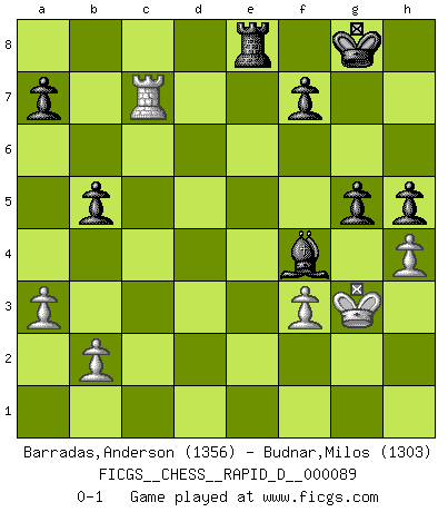 Last move : 0-1 2015 April 4 15:49:49 [Event "FICGS__CHESS__RAPID_D__000089"] [Site "FICGS"] [Date "2015.03.09"] [Round "1"] [White "Barradas,Anderson"] [Black "Budnar,Milos"] [Result "0-1"] [WhiteElo "1356"] [BlackElo "1303"] 1.e4 e5 2.Nf3 Nc6 3.d4 exd4 4.Nxd4 Bc5 5.Be3 Qf6 6.c3 Qg6 7.Nd2 Nxd4 8.cxd4 Bb4 9.e5 d5 10.exd6 Bxd6 11.a3 Nf6 12.Rc1 O-O 13.g3 Re8 14.Qf3 c6 15.Nc4 Bg4 16.Qg2 Bc7 17.h3 Be6 18.Be2 Bf5 19.Bd2 Be4 20.f3 Bd3 21.Ne3 Nd5 22.Bxd3 Qxd3 23.Qe2 Bxg3+ 24.Kf1 Nxe3+ 25.Bxe3 Rxe3 26.Qxd3 Rxd3 27.Ke2 Rxd4 28.Rhg1 Bf4 29.Rc2 Re8+ 30.Kf1 Rd1+ 31.Kg2 Rxg1 32.Kxg1 b5 33.Rxc6 Be3+ 34.Kg2 h6 35.Kg3 h5 36.Rc7 g5 37.h4 Bf4+ 0-1 Scotch game Kingside Castling by player Black (move 12) Player Black won this chess game. Follow this game move after move (download)There is only one thing Fischer does in Chess without pleasure: to lose ! (Boris Spassky) Zu meiner Zeit war ein 20 jähriger ein junger Spieler, heute ist er ein Veteran. (Garry Kasparov) En partidas rápidas, el Caballo es mas poderoso que el Alfil. (Vlastimil Hort) Ne tendez aucun piège pour le plaisir ! Ne jouez rien dans l'espoir que l'adversaire réagisse de façon stupide ! Prenez toujours pour acquis que l'adversaire va trouver le meilleur coup ! Ne jouez jamais de coup dans l'espoir que l'adversaire ne voie pas la menace ! Chacun de vos coups doit améliorer la position d'une façon ou d'une autre. Some people are so afraid to die that they never begin to live. (Henry Van Dyke)