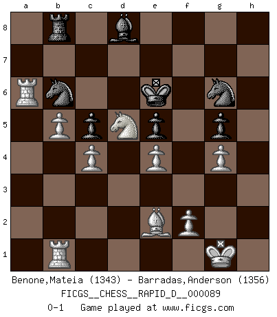 Last move : 0-1 2015 June 10 12:38:10 [Event "FICGS__CHESS__RAPID_D__000089"] [Site "FICGS"] [Date "2015.03.09"] [Round "1"] [White "Benone,Mateia"] [Black "Barradas,Anderson"] [Result "0-1"] [WhiteElo "1343"] [BlackElo "1356"] 1.Nf3 Nf6 2.c4 e6 3.d4 g6 4.Nc3 Bg7 5.e4 d6 6.Be2 O-O 7.O-O c5 8.d5 a6 9.a4 Qe8 10.Re1 Nbd7 11.dxe6 fxe6 12.Qxd6 e5 13.Bg5 Qf7 14.Rad1 Ne8 15.Qd5 Qxd5 16.Nxd5 Kf7 17.b4 b6 18.Be7 Bf6 19.Bxf8 Nxf8 20.Nxb6 Rb8 21.Nxc8 Rxc8 22.b5 axb5 23.axb5 Ke6 24.g4 g5 25.Ra1 Nc7 26.Ra7 h5 27.h3 hxg4 28.hxg4 Nd7 29.Rb1 Na8 30.Ne1 Nab6 31.Nc2 Nf8 32.Ne3 Ng6 33.Ra6 Rb8 34.Nd5 Bd8 0-1 This chess game has been lost on time (started : 2015.03.09 9:45:12) Reti Opening Kingside Castling by player Black (move 6) Kingside Castling by player White (move 7) Player Black won this chess game. Follow this game move after move (download)I believe that Chess possesses a magic that is also a help in advanced age. A rheumatic knee is forgotten during a game of Chess and other events can seem quite unimportant in comparison with a catastrophe on the chessboard. (Vlastimil Hort) Frage: Gibt es etwas was Sie mehr lieben als Autobahnen ohne Tempobegrenzungen? - Antwort: Deutsche Frauen ohne Tempobegrenzungen. (Loek van Wely) Bobby Fischer es el mas grande genio de Ajedrez de todos los tiempos. (Alexander Kotov) Vouloir jouer aux échecs contre soi-même est aussi paradoxal que vouloir marcher sur son ombre. (Stefan Zweig) Success without honor is an unseasoned dish; it will satisfy your hunger, but it won't taste good. (Joe Paterno)