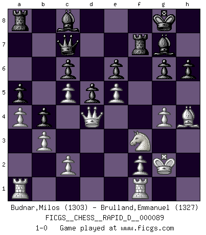 Last move : 1-0 2015 June 3 23:57:53 [Event "FICGS__CHESS__RAPID_D__000089"] [Site "FICGS"] [Date "2015.03.09"] [Round "1"] [White "Budnar,Milos"] [Black "Brulland,Emmanuel"] [Result "1-0"] [WhiteElo "1303"] [BlackElo "1327"] 1.e4 c6 2.d4 d5 3.Nc3 e6 4.e5 a6 5.Nf3 Ne7 6.Bg5 h6 7.Bh4 g5 8.Bg3 Bg7 9.h3 Nf5 10.Bh2 O-O 11.Be2 Nd7 12.O-O Re8 13.g4 Ne7 14.Na4 Qa5 15.b3 b5 16.Nc5 Nxc5 17.dxc5 Qc7 18.Qd4 Ng6 19.Bg3 a5 20.a4 b4 21.Bd3 Rf8 22.Bxg6 fxg6 23.Kg2 Rf7 24.h4 gxh4 25.Bxh4 1-0 This chess game has been lost on time (started : 2015.03.09 9:45:12) Caro-Kann defense Kingside Castling by player Black (move 10) Kingside Castling by player White (move 12) Player White won this chess game. Follow this game move after move (download)Chess demands total concentration. (Bobby Fischer) Man braucht nicht immer den besten Zug zu spielen: Ein Zug muß aktiv, unternehmungslustig, korrekt und schön sein. (David Bronstein) El Ajedrez lo es todo: arte, ciencia y deporte. (Anatoly Karpov) Les échecs, c'est l'art d'analyser. (Mikhail Botvinnik) It is not enough to be a good player... you must also play well. (Siegbert Tarrasch)