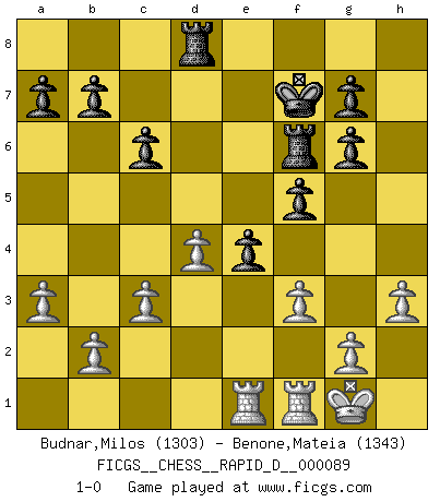 Last move : 1-0 2015 June 9 0:31:51 [Event "FICGS__CHESS__RAPID_D__000089"] [Site "FICGS"] [Date "2015.03.09"] [Round "1"] [White "Budnar,Milos"] [Black "Benone,Mateia"] [Result "1-0"] [WhiteElo "1303"] [BlackElo "1343"] 1.e4 e5 2.Nf3 Nf6 3.Nxe5 d6 4.Nf3 Nxe4 5.d4 d5 6.Bd3 Be7 7.O-O Nc6 8.a3 O-O 9.Be3 Bg4 10.h3 Bh5 11.Nbd2 Bg6 12.Bb5 Qd6 13.Bxc6 Qxc6 14.Ne5 Qd6 15.Nxg6 hxg6 16.Nxe4 dxe4 17.Qg4 f5 18.Qf4 Qxf4 19.Bxf4 c6 20.Be5 Bf6 21.Bxf6 Rxf6 22.Rae1 Rd8 23.c3 Kf7 24.f3 1-0 This chess game has been lost on time (started : 2015.03.09 9:45:12) Petrov : Classical attack Kingside Castling by player White (move 7) Kingside Castling by player Black (move 8) Player White won this chess game. Follow this game move after move (download)In Chess, at least, the brave inherit the earth. (Edmar Mednis) Je älter ich werde, um so mehr schätze ich die Bauern. (Paul Keres) Durante una competencia de Ajedrez, un Maestro de Ajedrez deberá ser una combinación de presa de caza y un Monge. (Alexander Alekhine) Ce qui caractérise les parties de combat, c'est que si le défenseur a constamment de difficiles problèmes à résoudre, l'attaquant doit chercher sans relâche de nouvelles possibilités d'attaque. (Koblentz) When a man with money meets a man with experience, the man with experience leaves with money and the man with money leaves with experience. (Anonymous)