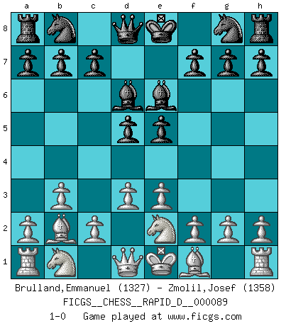 Last move : 1-0 2015 May 5 21:24:24 [Event "FICGS__CHESS__RAPID_D__000089"] [Site "FICGS"] [Date "2015.03.09"] [Round "1"] [White "Brulland,Emmanuel"] [Black "Zmolil,Josef"] [Result "1-0"] [WhiteElo "1327"] [BlackElo "1358"] 1.b3 d5 2.e3 e5 3.Bb2 Bd6 4.Ne2 Be6 5.d3 1-0 This chess game has been lost on time (started : 2015.03.09 9:45:12) Nimzovich-Larsen attack : Classical variation Player White won this chess game. Follow this game move after move (download)Bobby Fischer is the greatest Chess player who has ever lived. (Ken Smith) Das Schachspiel hat wie die Liebe, die Musik, die Fähigkeit, den Menschen glücklich zu machen. Ich habe ein leises Gefühl des Bedauerns für jeden, der das Schachspiel nicht kennt, so wie ich jeden bedaure, der die Liebe nicht kennt. (Siegbert Tarrasch) Ser exitoso en el Ajedrez te permite descubrir tu propia personalidad. Eso es lo que deseo para los niños de mi clase. (Saudin Robovic) On n'a jamais que l'âge auquel on a commence à jouer aux échecs car après on cesse de vieillir. (Capablanca) Nowadays, anyone who cannot speak English and is incapable of using the Internet is regarded as backward. (Al-Waleed bin Talal)