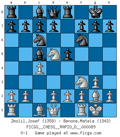 Last move : 0-1 2015 May 20 10:40:53 [Event "FICGS__CHESS__RAPID_D__000089"] [Site "FICGS"] [Date "2015.03.09"] [Round "1"] [White "Zmolil,Josef"] [Black "Benone,Mateia"] [Result "0-1"] [WhiteElo "1358"] [BlackElo "1343"] 1.c4 e5 2.Nc3 Nf6 3.Nf3 Nc6 4.g3 Bb4 5.Bg2 O-O 6.O-O Re8 7.Nd5 Bc5 0-1 This chess game has been lost on time (started : 2015.03.09 9:45:12) English Opening Kingside Castling by player Black (move 5) Kingside Castling by player White (move 6) Player Black won this chess game. Follow this game move after move (download)Becoming successful at Chess allows you to discover your own personality. That's what I want for the kids I teach. (Saudin Robovic) Es hat in meinem Leben Zeiten gegeben, in denen das Schachspiel, wenn nicht zum Lebenszweck, so doch zu einem regelrechten Lebensersatz geworden ist. Man fühlt sich in solchen Zeiten nicht so, als besäße man eine göttliche Gabe, sondern eher so, als sei man von ihr besessen. (Garry Kasparov) El tablero es el mundo, las piezas es el fenomeno del universo, las reglas del juego son lo que llamamos leyes de la naturaleza y el jugador del lado opuesto, se encuentra oculto a nuestra vista. (Thomas Huxley) Un millionnaire : 'Monsieur Steinitz ! Vous ne participez aux tournois que pour l'argent, alors que moi je n'y viens que pour l'honneur.' Steinitz : 'Chacun joue pour ce qu'il n'a pas'... I've never seen so many men wasted so badly. (Blondie in The Good, The Bad and The Ugly)