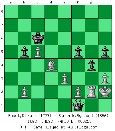 Last move : 0-1 2015 May 23 18:39:31 [Event "FICGS__CHESS__RAPID_B__000225"] [Site "FICGS"] [Date "2015.03.09"] [Round "1"] [White "Faust,Dieter"] [Black "Sternik,Ryszard"] [Result "0-1"] [WhiteElo "1729"] [BlackElo "1856"] 1.d4 d5 2.c4 c6 3.Nf3 Nf6 4.e3 Bf5 5.Nc3 e6 6.Nh4 Bg6 7.a3 Bh5 8.Qb3 Qc7 9.Bd2 Be7 10.h3 dxc4 11.Bxc4 Nbd7 12.Rc1 O-O-O 13.a4 a6 14.a5 Ne8 15.g4 Bxh4 16.gxh5 Ndf6 17.Qa4 Nd6 18.Bd3 g5 19.Rg1 h6 20.Rg2 Nxh5 21.Na2 Nb5 22.Nb4 Rd6 23.Qd1 Nf6 24.Qf3 Nd5 25.Bxb5 axb5 26.a6 Kb8 27.Ra1 Nxb4 28.Bxb4 Rd5 29.Qf6 Re8 30.axb7 Rf5 31.Ra8+ Kxb7 32.Qxf5 exf5 33.Rxe8 c5 34.dxc5 g4 35.Kf1 Qd7 36.Rf8 Qd3+ 37.Kg1 Bd8 38.Rxf7+ Bc7 39.Rxc7+ Kxc7 40.Bc3 h5 41.Kh2 Kc6 42.Bd4 Qf1 0-1 QGD Slav : 4.e3 Bf5 Queenside Castling by player Black (move 12) Player Black won this chess game. Follow this game move after move (download)Spassky will not be psyched out by Fischer. (Mike Goodall) Ich glaube nicht an Psychologie, ich glaube an gute Züge. (Robert James Fischer) Cuando no sepas que mover, espera por una idea que se le venga a la la cabeza de tu oponente. Tenlo por seguro de que esa idea estará incorrecta. (Siegbert Tarrasch) J'ai vu le vaincu d'Echecs jouer des années durant dans l'espoir de la fête de la victoire. Car tu es plus riche de ce qu'elle existe si même elle n'est point pour toi. Ainsi de la perle du fond des mers. (Antoine de Saint-Exupéry) The real danger is not that computers will begin to think like men, but that men will begin to think like computers. (Sydney J. Harris)