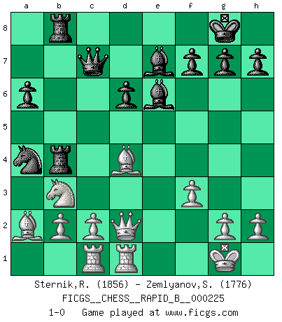Last move : 1-0 2015 May 10 21:53:12 [Event "FICGS__CHESS__RAPID_B__000225"] [Site "FICGS"] [Date "2015.03.09"] [Round "1"] [White "Sternik,Ryszard"] [Black "Zemlyanov,Sergey"] [Result "1-0"] [WhiteElo "1856"] [BlackElo "1776"] 1.e4 c5 2.Nf3 d6 3.d4 cxd4 4.Nxd4 Nf6 5.Nc3 a6 6.Bg5 Nbd7 7.Bc4 Qb6 8.Bb3 e6 9.O-O Be7 10.Be3 Nc5 11.f3 O-O 12.Qd2 Qc7 13.Rfd1 Bd7 14.Rac1 b5 15.a3 Rfb8 16.Ba2 b4 17.axb4 Rxb4 18.Nb3 Na4 19.Nd5 Nxd5 20.exd5 Rab8 21.dxe6 Bxe6 22.Bd4 1-0 This chess game has been lost on time (started : 2015.03.09 14:3:25) Sicilian : Najdorf, 6.Bg5 Kingside Castling by player White (move 9) Kingside Castling by player Black (move 11) Player White won this chess game. Follow this game move after move (download)Good positions don't win games, good moves do. (Gerald Abrahams) Schach ist mein Leben, meine Leidenschaft, was ich gelernt habe und seit meinem 14. Lebensjahr profimässig praktiziere. Darauf zu verzichten, würde mir sehr schwer fallen. (Viktor Kortschnoi) Nos gusta pensar. (Gary Kasparov) On a dit que l'homme se distingue de l'animal par le fait qu'il achète plus de livres qu'il ne peut en lire. Je voudrais suggérer qu'inclure à la liste des livres quelques livres d'échecs rendrait la distinction manifeste. (Edward Lasker) Now you put water in a cup, it becomes the cup; You put water into a bottle it becomes the bottle; You put it in a teapot it becomes the teapot. Water can flow or it can crash. Be water, my friend. (Bruce Lee)