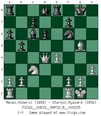 Last move : 1-0 2015 April 26 16:40:54 [Event "FICGS__CHESS__RAPID_B__000225"] [Site "FICGS"] [Date "2015.03.09"] [Round "1"] [White "Mevel,Alberic"] [Black "Sternik,Ryszard"] [Result "1-0"] [WhiteElo "1858"] [BlackElo "1856"] 1.e4 e5 2.Nf3 Nc6 3.Bb5 a6 4.Ba4 Bc5 5.c3 b5 6.Bb3 d6 7.d4 exd4 8.cxd4 Bb6 9.h3 Nf6 10.O-O O-O 11.Nc3 Re8 12.Bg5 h6 13.Bh4 g5 14.Nxg5 hxg5 15.Bxg5 Bxd4 16.Bd5 Bd7 17.Bxc6 Bxc6 18.Qxd4 1-0 Ruy Lopez : Classical defense deferred Kingside Castling by player White (move 10) Kingside Castling by player Black (move 10) Player White won this chess game. Follow this game move after move (download)The tactician must know what to do whenever something needs doing; the strategist must know what to do when nothing needs doing. (Savielly Tartakover) Schach ist wie eine schöne Frau, zu der wir ständig zurückkehren, gleichviel, wie oft sie uns zurückweist. (Anonymous) Tu no necesitas jugar muy bien, únicamente ayudar a tu oponenet a que juegue muy mal. (Genrikh Chepukaitis) Plusieurs personnes se sont demandées comment Tal faisait pour gagner... En fait, c'est très simple ! Il met ses pièces au centre de l'échiquier et les sacrifie quelque part ! (David Bronstein) All politicians must be presumed guilty until they are proven innocent. (Dinesh De Silva)