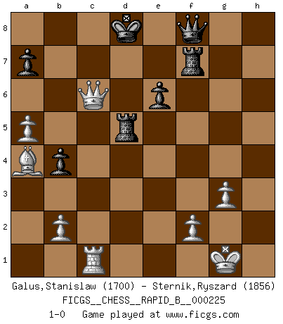 Last move : 1-0 2015 March 27 22:17:30 [Event "FICGS__CHESS__RAPID_B__000225"] [Site "FICGS"] [Date "2015.03.09"] [Round "1"] [White "Galus,Stanislaw"] [Black "Sternik,Ryszard"] [Result "1-0"] [WhiteElo "1700"] [BlackElo "1856"] 1.d4 d5 2.c4 c6 3.Nf3 Nf6 4.Nc3 e6 5.Bg5 dxc4 6.e4 b5 7.e5 h6 8.Bh4 g5 9.Nxg5 hxg5 10.Bxg5 Be7 11.exf6 Bxf6 12.Bxf6 Qxf6 13.g3 Bb7 14.Bg2 Na6 15.a4 Qe7 16.O-O b4 17.Ne4 O-O-O 18.Rc1 f5 19.Nd2 Rxd4 20.Qe2 Nc5 21.Nxc4 Nb3 22.Ne5 Nxc1 23.Rxc1 Rd6 24.Nxc6 Bxc6 25.Bxc6 Kd8 26.Qe5 Rh7 27.Bb5 Qf8 28.Qc5 Rf7 29.a5 f4 30.Ba4 fxg3 31.hxg3 Rd5 32.Qc6 1-0 QGD Slav : 4.Nc3 Kingside Castling by player White (move 16) Queenside Castling by player Black (move 17) Player White won this chess game. Follow this game move after move (download)In a gambit you give up a Pawn for the sake of getting a lost game. (Samuel Standige Boden) Viele Opfer benötigen überhaupt keine konkrete Berechnung. Es genügt sich die entstehende Position kurz vorzustellen, um uns davon zu überzeugen, dass das Opfer korrekt ist. (Mikhail Nekhemyevich Tal) Las Aperturas te enseñan aperturas. ¡Los Finales te enseñan Ajedrez!. (Stephan Gerzadowicz) Demandez au pauvre Cg1 ce qu'il en pense. Eduard Gufeld à propos de la variante Saemisch de l'Est-Indienne. If you ain't just a little scared when you enter a casino, you are either very rich or you haven't studied the games enough. (Pappy)