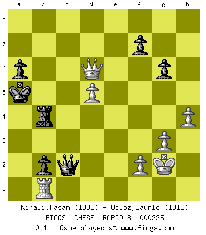 Last move : 0-1 2015 June 12 12:26:55 [Event "FICGS__CHESS__RAPID_B__000225"] [Site "FICGS"] [Date "2015.03.09"] [Round "1"] [White "Kirali,Hasan"] [Black "Ocloz,Laurie"] [Result "0-1"] [WhiteElo "1838"] [BlackElo "1912"] 1.d4 Nf6 2.c4 c5 3.d5 b5 4.Nf3 e6 5.Bg5 exd5 6.cxd5 d6 7.e4 a6 8.a4 Be7 9.Bd3 Nxd5 10.exd5 Bxg5 11.O-O b4 12.Nxg5 Qxg5 13.Re1+ Kd8 14.Nd2 Nd7 15.Ne4 Qh6 16.Nd2 Bb7 17.Nc4 Kc7 18.Na5 Qf6 19.Nxb7 Kxb7 20.a5 Ne5 21.Bc2 Rae8 22.Ba4 Re7 23.Re3 Ng6 24.Bc6+ Ka7 25.Rxe7+ Qxe7 26.Qd2 Qf6 27.Re1 Rc8 28.Qc2 Ne5 29.Qxh7 g6 30.Qh6 Qd8 31.Qh3 Rc7 32.Ba4 Re7 33.Ra1 Nc4 34.b3 Nxa5 35.g3 Re4 36.Rd1 Qc7 37.Kg2 c4 38.bxc4 Rxc4 39.Qh6 b3 40.Qe3+ Qb6 41.Qe7+ Nb7 42.Bc6 b2 43.Rb1 Rc1 44.Bxb7 Rc7 45.Qe1 Rxb7 46.h4 Qb3 47.Qd2 Rb4 48.Qg5 Qc2 49.Qe3+ Kb7 50.Qe7+ Kb6 51.Qxd6+ Ka5 0-1 Benko gambit Kingside Castling by player White (move 11) Player Black won this chess game. Follow this game move after move (download)Everything is in a state of flux, and this includes the world of Chess. (Mikhail Botvinnik) Bobby Fischer ist kein Vorbild für die heutige Jugend. (Viktor Kortschnoi) No todos los artistas son jugadores de Ajedrez, pero todos los jugadores de Ajedrez son artistas. (Marcel Duchamp) La tactique est l'élément le plus important du milieu de jeu. (Siegbert Tarrasch) All battles are fought by scared men who'd rather be someplace else. (John Wayne in the movie In harm's way)
