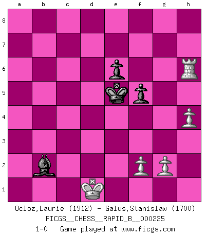 Last move : 1-0 2015 March 22 17:39:18 [Event "FICGS__CHESS__RAPID_B__000225"] [Site "FICGS"] [Date "2015.03.09"] [Round "1"] [White "Ocloz,Laurie"] [Black "Galus,Stanislaw"] [Result "1-0"] [WhiteElo "1912"] [BlackElo "1700"] 1.e4 c6 2.d4 d5 3.Nc3 dxe4 4.Nxe4 Nd7 5.c3 Ngf6 6.Nxf6+ Nxf6 7.Bc4 Qc7 8.Qb3 e6 9.Nf3 b6 10.Bg5 h6 11.Bxf6 gxf6 12.a4 a5 13.O-O Bb7 14.Qc2 O-O-O 15.Qe2 Kb8 16.Ba6 Ba8 17.b4 axb4 18.Rab1 c5 19.dxc5 bxc5 20.Rfc1 Qb6 21.Bd3 Be7 22.a5 Qd6 23.Be4 Rd7 24.cxb4 cxb4 25.Qb5+ Rb7 26.Bxb7 Bxb7 27.Qh5 Rd8 28.Ne1 Qf4 29.Qb5 Ka8 30.Rd1 Rc8 31.Rd7 Rc7 32.Rxc7 Qxc7 33.Nd3 Qc6 34.Qxc6 Bxc6 35.Nxb4 Be4 36.Rc1 Bxb4 37.Rc4 Bxa5 38.Rxe4 Kb7 39.Rh4 Bd2 40.Rd4 Bc3 41.Rd7+ Kc6 42.Rxf7 Kd6 43.Rh7 Bd2 44.Kf1 Ke5 45.Ke2 Bc1 46.Kd1 Bb2 47.Rxh6 f5 48.h4 1-0 Caro-Kann : Steinitz variation Kingside Castling by player White (move 13) Queenside Castling by player Black (move 14) 10 pieces endgame at move 42 : White KRPPP , Black KBPPP WHITE : King + 1 Rook 3 Pawns BLACK : King + 1 Bishop 3 Pawns 9 pieces endgame at move 47 : White KRPPP , Black KBPP WHITE : King + 1 Rook 3 Pawns BLACK : King + 1 Bishop 2 Pawns Player White won this chess game. Follow this game move after move (download)Chess is no whit inferior to the violin, and we have a large number of professional violinists. (Mikhail Botvinnik) Schach verlangt totale Konzentration. (Robert James Fischer) Ayuda a tus piezas para que ellas te puedan ayudar. (Paul Morphy) Votre seul travail dans les ouvertures est d'obtenir un milieu de partie jouable. (Lajos Portish) The beginning is the most important part of the work. (Plato)