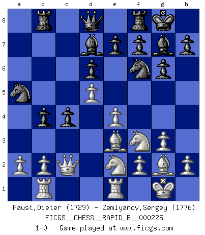 Last move : 1-0 2015 May 31 23:48:48 [Event "FICGS__CHESS__RAPID_B__000225"] [Site "FICGS"] [Date "2015.03.09"] [Round "1"] [White "Faust,Dieter"] [Black "Zemlyanov,Sergey"] [Result "1-0"] [WhiteElo "1729"] [BlackElo "1776"] 1.d4 Nf6 2.c4 g6 3.g3 Bg7 4.Bg2 O-O 5.Nc3 d6 6.Nf3 Nc6 7.O-O a6 8.d5 Na5 9.Qd3 c5 10.e4 Rb8 11.Rb1 b5 12.cxb5 c4 13.Qc2 axb5 14.Be3 b4 15.Ne2 Bd7 16.Rfe1 1-0 This chess game has been lost on time (started : 2015.03.09 14:3:25) King's Indian : 3.g3 Kingside Castling by player Black (move 4) Kingside Castling by player White (move 7) Player White won this chess game. Follow this game move after move (download)The game of Chess is not merely an idle amusement; several very valuable qualities of the mind are to be acquired and strengthened by it, so as to become habits ready on all occasions; for life is a kind of Chess. (Benjamin Franklin) Obwohl ich vom Stil her kaum zu den Priestern der Schachkunst gezählt werde, halte ich Schach doch für eine Kunst. (Tigran Petrosjan) Botvinnik trataba de restarle el misterio al Ajedrez, siempre relacionandolo a situaciones de la vida ordinaria. El gustaba de llamar al Ajedrez un típico problema inexacto similar a aquellos de los cuales la gente siempre tiene que enfrentarse en la vida cotidiana. (Garry Kasparov) La solitude du joueur d'Echecs à l'approche du mat est semblable à celle du condamné. (Francis Szpiner) For to win one hundred victories in one hundred battles is not the acme of skill. To subdue the enemy without fighting is the acme of skill. (Sun Tzu)