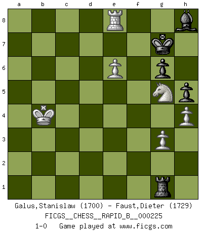 Last move : 1-0 2015 May 26 16:48:19 [Event "FICGS__CHESS__RAPID_B__000225"] [Site "FICGS"] [Date "2015.03.09"] [Round "1"] [White "Galus,Stanislaw"] [Black "Faust,Dieter"] [Result "1-0"] [WhiteElo "1700"] [BlackElo "1729"] 1.d4 Nf6 2.c4 e6 3.Nc3 d5 4.cxd5 exd5 5.Bg5 c6 6.e3 Nbd7 7.Bd3 Be7 8.Qc2 Nf8 9.h3 Ne6 10.Bh4 g6 11.Nf3 O-O 12.O-O c5 13.dxc5 Nxc5 14.Rfd1 Nxd3 15.Qxd3 Bf5 16.Qb5 Qb6 17.Qxb6 axb6 18.Rd2 Be6 19.Bxf6 Bxf6 20.Nxd5 Bxd5 21.Rxd5 Bxb2 22.Rb1 Bh8 23.Rxb6 Rxa2 24.Rxb7 Rfa8 25.R5d7 Rb2 26.Rxf7 Ra1+ 27.Kh2 R1a2 28.Rfe7 Rxb7 29.Rxb7 Rxf2 30.Rb8+ Kg7 31.Kg3 Re2 32.Re8 Ra2 33.Ng5 Ra3 34.Kf4 Ra2 35.g3 h5 36.e4 Ra4 37.h4 Rb4 38.Rd8 Ra4 39.Ke5 Ra6 40.Kd4 Ra1 41.Re8 Ra4+ 42.Kc5 Ra5+ 43.Kb4 Ra1 44.e5 Rg1 45.e6 1-0 Queen's pawn game Kingside Castling by player Black (move 11) Kingside Castling by player White (move 12) Player White won this chess game. Follow this game move after move (download)A big shock; the best chess player in history has passed away. (Lajos Portisch, about Bobby Fischer's death) Ich bin es gewohnt, das die Jugend mir überhaupt keinen Respekt entgegenbringt. (Alexander Morozewich) Una compensación adecuada por un sacrificio es tener una combinación sólida que conduce a una posición ganadora; una compensación adecuada por una metida de pata es dejar a tu oponente arrebatar una derrota de las fauces de la victoria. (Bruce A. Moon) J'ai toujours senti une vague pitié pour l'homme qui ne connaît rien aux échecs, tout comme j'en aurais pour un homme ignorant de l'amour. Les Echecs, comme la musique ou comme l'amour, ont le pouvoir de rendre heureux. (Siegbert Tarrasch) Winning isn't everything... but losing is nothing. (Mednis)