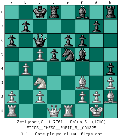 Last move : 0-1 2015 May 8 9:38:33 [Event "FICGS__CHESS__RAPID_B__000225"] [Site "FICGS"] [Date "2015.03.09"] [Round "1"] [White "Zemlyanov,Sergey"] [Black "Galus,Stanislaw"] [Result "0-1"] [WhiteElo "1776"] [BlackElo "1700"] 1.e4 c6 2.d4 d5 3.e5 Bf5 4.Nf3 e6 5.Be2 c5 6.Be3 Ne7 7.dxc5 Nd7 8.Nd4 Nxe5 9.O-O a6 10.Nc3 N5c6 11.Bf3 Nxd4 12.Bxd4 Qc7 13.Re1 O-O-O 14.Be5 Qc6 15.b4 f6 16.Bd6 Ng6 17.Bg3 h5 18.h3 h4 19.Bh2 Ne5 0-1 This chess game has been lost on time (started : 2015.03.09 14:3:25) Caro-Kann : Advance variation Kingside Castling by player White (move 9) Queenside Castling by player Black (move 13) Player Black won this chess game. Follow this game move after move (download)In Chess, just as in life, today's bliss may be tomorrow's poison. (Assaic) Ich las kürzlich ein Buch von Nietzsche. Er sagte Religion verdumme nur die Menschen. Ich stimme zu. (Robert James Fischer) Un mal plan es mejor que no tener ningún plan. (Frank Marshall) Vous savez, camarade Pachman, je n'éprouve pas de plaisir à être ministre, je jouerais plutôt aux échecs comme vous, ou alors ferais une révolution au Venezuela. (Che Guevara à Ludek Pachman, 'Checkmate in Prague', 1975) Good luck. You're gonna need it. (Han Solo in Star Wars ep.6)
