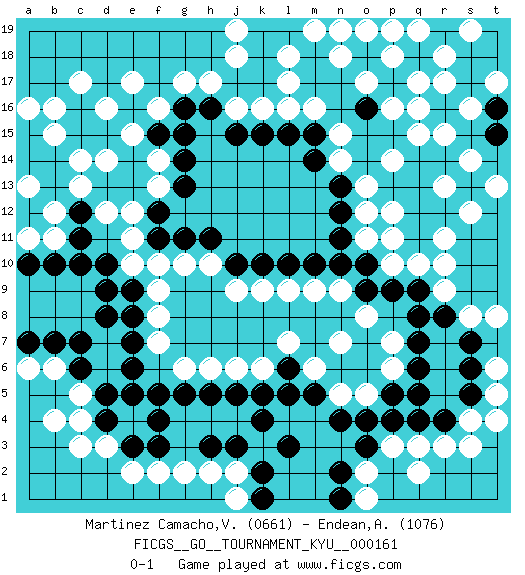 Last move : 0-1 2015 October 3 4:29:50 [Event "FICGS__GO__TOURNAMENT_KYU__000161"] [Site "FICGS"] [Date "2015.03.12"] [Round "1"] [Black "Martinez Camacho,Victor Hugo"] [White "Endean,Andrew"] [Result "0-1"] [Rating 1 "0661"] [Rating 2 "1076"] 1.d5 q16 2.k4 d16 3.q4 k16 4.d10 q10 5.q8 c3 6.f4 c5 7.d4 c4 8.c7 d3 9.e3 e2 10.e5 f2 11.f3 g2 12.f5 c13 13.c12 d12 14.c11 e12 15.d8 f10 16.e9 f9 17.e8 f8 18.e7 f7 19.e6 g6 20.g5 h6 21.h5 j6 22.j5 k6 23.n4 n7 24.l6 l7 25.l5 m6 26.m5 n5 27.o4 o5 28.p5 p6 29.q6 p7 30.p9 o8 31.o9 n9 32.n10 m9 33.m10 l9 34.k10 k9 35.j10 j9 36.h11 g10 37.g11 h10 38.f11 e11 39.f12 f13 40.g13 f14 41.g14 e10 42.c10 o11 43.f15 e15 44.e16 f16 45.g15 e17 46.b13 c14 47.b14 b15 48.c6 b6 49.b7 a6 50.h3 h2 51.j3 j2 52.k2 r3 53.q9 r10 54.n11 o12 55.n12 o13 56.n13 n14 57.l10 q3 58.q5 p3 59.o3 o2 60.n2 o1 61.n1 q2 62.q7 r9 63.r4 s3 64.k1 j1 65.l3 s4 66.r8 s8 67.s5 t5 68.s6 t6 69.s7 t4 70.m14 n15 71.m15 m16 72.l15 l16 73.k15 j16 74.h16 h17 75.g16 g17 76.j15 r17 77.a15 a16 78.c15 b16 79.a14 b12 80.a12 a13 81.c16 c17 82.d15 d14 83.a7 b4 84.k5 b11 85.b10 a11 86.a10 p10 87.o10 p14 88.j17 j18 89.k17 l17 90.k18 l18 91.k19 j19 92.l19 m19 93.r14 r15 94.q14 q15 95.q13 s14 96.q12 p11 97.q11 r11 98.r12 s12 99.s13 t13 100.p13 p12 101.p4 t8 102.d9 r13 103.n19 n18 104.o18 o19 105.p19 n19 106.p17 o17 107.q18 p18 108.r19 q19 109.s18 p19 110.s17 q17 111.t18 r18 112.t16 s16 113.t15 s19 114.t19 t17 115.o16 p16 0-1 Here are the names of the openings (joseki) played in the four corners : Corner d4 : d5 c3 Takamoku (Gomok, Gaomu`) 5-4 Point. The takamoku (high) point (5-4). With its emphasis on influence, the 5-4 point complements the 4-4 (hoshi) point in creating an influence-oriented fuseki. San-san. White plays the 3-3 when Black has a stone at top such as marked. Player White won this Go (weiqi, baduk) game. Follow this game move after move (download)Keshi is worth as much as an invasion ! (Anonymous) Be who you are, and say what you feel because those who mind don't matter, and those who matter don't mind. (Dr Seuss)