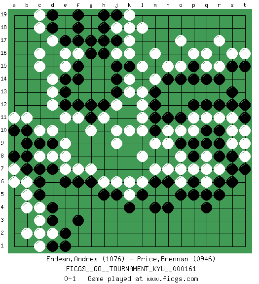 Last move : 0-1 2015 September 20 19:29:0 [Event "FICGS__GO__TOURNAMENT_KYU__000161"] [Site "FICGS"] [Date "2015.03.12"] [Round "1"] [Black "Endean,Andrew"] [White "Price,Brennan"] [Result "0-1"] [Rating 1 "1076"] [Rating 2 "0946"] 1.q4 c16 2.d4 q16 3.q10 k17 4.k4 d10 5.r14 o17 6.e17 e15 7.g16 d17 8.d18 e16 9.f17 h17 10.g17 j16 11.h18 j18 12.h16 g10 13.c7 e7 14.j17 l18 15.h17 l15 16.j15 k16 17.j14 j9 18.n4 r15 19.q14 q15 20.p14 o15 21.o14 n15 22.n14 m14 23.m13 k14 24.j13 k13 25.k12 l13 26.m12 l12 27.k11 l11 28.m11 l10 29.h12 h11 30.g12 k10 31.f12 d12 32.e13 d13 33.f14 j10 34.m10 k6 35.h5 h6 36.j5 j6 37.g6 g7 38.f6 f7 39.e6 r7 40.r6 q6 41.r5 p7 42.r8 q8 43.s7 q7 44.r9 m7 45.n6 n7 46.m6 l6 47.l5 o6 48.o5 j12 49.j11 j12 50.c9 c10 51.d9 e9 52.b10 b11 53.a10 a11 54.b8 c3 55.d3 c4 56.c5 b5 57.c6 b6 58.b7 d2 59.e2 c1 60.e1 b2 61.p5 o8 62.p6 d8 63.d7 e8 64.d1 c2 65.f3 k5 66.m4 o10 67.o9 n9 68.p9 n10 69.o11 m9 70.n11 p10 71.q9 o7 72.q5 p11 73.p12 q11 74.q12 r11 75.r12 s9 76.s8 s10 77.s12 s11 78.t12 c18 79.d19 c19 80.f18 t8 81.t7 r17 82.s15 s16 83.t15 t16 84.s13 f11 85.e12 e11 86.j19 k18 87.f19 k19 88.h19 c8 89.b9 a7 90.a8 b4 91.e14 d14 92.f15 t9 93.s6 a6 94.p15 p16 95.k15 m16 96.t11 t10 97.g11 l8 98.r10 f16 99.p8 c15 100.pass pass 101.pass pass 0-1 Comment by player 2 : Brennan Price : Andrew, thank you for the game. If it weren't for the t-side invasion, the komi would not have saved me. Looking forward to another game in the future. Brennan Price Andrew, thank you for the game. If it weren't for the t-side invasion, the komi would not have saved me. Looking forward to another game in the future. Andrew Endean Yes it was very close, thanks for the game Here are the names of the openings (joseki) played in the four corners : Corner q16 : q16 r14 Hoshi (Hwajeom, Seongjeom, Xingwei`) 4-4 Point. The star or hoshi (4-4) point, emphasizing influence at the potential expense of territory. Ikken Kakari (Hankan Keolch'im, Yi Gua`jiao~, 1-Space Low Approach). Black 2 is the standard approach move to the 4-4. Corner d16 : c16 e17 Komoku (Somok, Xiao~mu`) 3-4 Point. The komoku (3-4) point is the traditional corner enclosure move.. Ikken Kakari (Hankan Keolch'im, Yi Gua`jiao~, 1-Space Low Pincer). The small knight move is the basic approach move to the 3-4 point stone. It has been continually used for over four centuries. There are limitless variations, with new moves constantly being discovered. Black 2 opens the door to a treaure store of joseki. Player White won this Go (weiqi, baduk) game. Follow this game move after move (download)Win the stones, lose the game. (Anonymous) Optimism is a variety of information deficit. Sometimes especially true for correspondence chess games. (Michael Aigner)