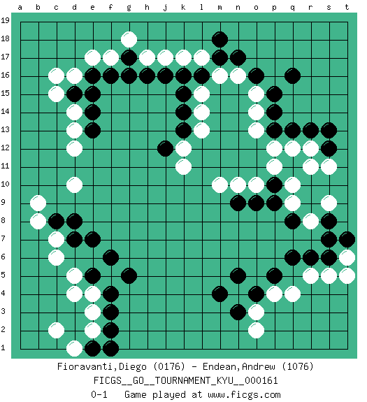 Last move : 0-1 2015 August 6 8:17:44 [Event "FICGS__GO__TOURNAMENT_KYU__000161"] [Site "FICGS"] [Date "2015.03.12"] [Round "1"] [Black "Fioravanti,Diego"] [White "Endean,Andrew"] [Result "0-1"] [Rating 1 "0176"] [Rating 2 "1076"] 1.q16 d4 2.q6 d16 3.m4 d10 4.f4 c6 5.j16 q10 6.p10 p11 7.o9 q9 8.q8 p12 9.e16 e17 10.f16 f17 11.q13 q12 12.g17 g18 13.h16 h17 14.g16 j17 15.k16 k17 16.l16 l17 17.d15 c16 18.e14 c15 19.e5 d5 20.f6 e3 21.f3 e2 22.f2 e4 23.g5 o10 24.p9 n10 25.n9 m10 26.p13 o13 27.p14 o14 28.p15 o15 29.o16 n16 30.n17 m16 31.m17 l15 32.k15 l14 33.k14 l13 34.k13 k12 35.j12 k11 36.d7 c7 37.e7 q4 38.p5 p4 39.n5 o3 40.n3 o2 41.m18 d14 42.e15 d13 43.e13 d12 44.c8 b8 45.d8 b9 46.o4 r5 47.r6 s5 48.s6 t6 49.t7 t5 50.s7 r8 51.s8 s9 52.e1 d1 53.f1 c2 54.s12 r11 55.r13 r12 56.s13 s11 0-1 This go game has been lost on time (started : 2015.03.12 15:50:4) Here are the names of the openings (joseki) played in the four corners : Corner d4 : d4 f4 Hoshi (Hwajeom, Seongjeom, Xingwei`) 4-4 Point. The star or hoshi (4-4) point, emphasizing influence at the potential expense of territory. Ikken Takagakari (Hankan Nop'dakeolch'im, Yi Gaojia, 1-Space High Approach). White typically responds at 6-4 or 3-10. White 4-10 is played when White finds play on the right side advantageous. White 4-8 or 3-8 may be played when White has support at top. Corner d16 : d16 j16 Hoshi (Hwajeom, Seongjeom, Xingwei`) 4-4 Point. The star or hoshi (4-4) point, emphasizing influence at the potential expense of territory. Corner q16 : q16 p11 Hoshi (Hwajeom, Seongjeom, Xingwei`) 4-4 Point. The star or hoshi (4-4) point, emphasizing influence at the potential expense of territory. Player White won this Go (weiqi, baduk) game. Follow this game move after move (download)Answer the keima with a kosumi. (Anonymous) All the biggest technological inventions created by man - the airplane, the automobile, the computer - says little about his intelligence, but speaks volumes about his laziness. (Mark Kennedy)