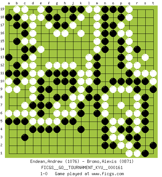 Last move : 1-0 2015 September 7 21:16:23 [Event "FICGS__GO__TOURNAMENT_KYU__000161"] [Site "FICGS"] [Date "2015.03.12"] [Round "1"] [Black "Endean,Andrew"] [White "Bromo,Alexis"] [Result "1-0"] [Rating 1 "1076"] [Rating 2 "0871"] 1.q4 d16 2.d4 q16 3.q10 k16 4.k4 d10 5.r14 k10 6.o17 p17 7.o16 p16 8.p15 q15 9.p14 q14 10.p13 q13 11.n15 o18 12.n18 m17 13.n17 m18 14.p18 q18 15.o19 m15 16.n14 m14 17.m13 l13 18.m12 l12 19.m11 l11 20.m10 l10 21.l9 k9 22.l8 k8 23.k7 j7 24.k6 j6 25.j5 h6 26.h5 g5 27.g4 f5 28.f4 e5 29.e4 d5 30.c5 c6 31.b5 b6 32.a5 a6 33.c3 q12 34.p12 r11 35.q11 r12 36.r10 s11 37.s10 s13 38.c17 d17 39.c16 c15 40.b15 c18 41.b18 d18 42.c14 d15 43.c13 c12 44.b12 b11 45.c11 d12 46.b10 d11 47.a11 c10 48.b11 b9 49.d7 d6 50.e9 d9 51.e8 d8 52.e7 g6 53.e10 e11 54.f11 f12 55.g11 g12 56.h11 h12 57.j11 j12 58.h8 g9 59.g8 h9 60.j9 j8 61.j10 f10 62.f9 k11 63.g10 d13 64.d14 e14 65.r3 o3 66.n3 o4 67.n4 p5 68.p4 o5 69.n5 n6 70.m6 n7 71.m7 n8 72.n9 o9 73.o10 p9 74.p10 q9 75.r9 r8 76.s8 r7 77.s7 r6 78.s6 r5 79.s5 r4 80.s4 p3 81.q3 q2 82.r2 p2 83.n2 r1 84.s1 q1 85.t2 c7 86.a13 a9 87.h17 j17 88.f18 f17 89.g17 h18 90.g18 g16 91.j18 h16 92.h19 k18 93.k19 l19 94.j19 e18 95.f19 e19 96.q5 q6 97.o2 p7 98.f7 b19 99.a18 c19 100.b17 m16 101.n16 g7 102.h10 a10 103.e6 t10 104.t9 q19 105.p19 t11 106.m8 m19 107.n19 1-0 Here are the names of the openings (joseki) played in the four corners : Corner q16 : q16 r14 Hoshi (Hwajeom, Seongjeom, Xingwei`) 4-4 Point. The star or hoshi (4-4) point, emphasizing influence at the potential expense of territory. Ikken Kakari (Hankan Keolch'im, Yi Gua`jiao~, 1-Space Low Approach). Black 2 is the standard approach move to the 4-4. Corner d4 : d4 j7 Hoshi (Hwajeom, Seongjeom, Xingwei`) 4-4 Point. The star or hoshi (4-4) point, emphasizing influence at the potential expense of territory. Corner d16 : d16 c17 Hoshi (Hwajeom, Seongjeom, Xingwei`) 4-4 Point. The star or hoshi (4-4) point, emphasizing influence at the potential expense of territory. Player Black won this Go (weiqi, baduk) game. Follow this game move after move (download)One big eye kills one small eye. (Anonymous) Horse racing is animated roulette. (Roger Kahn)