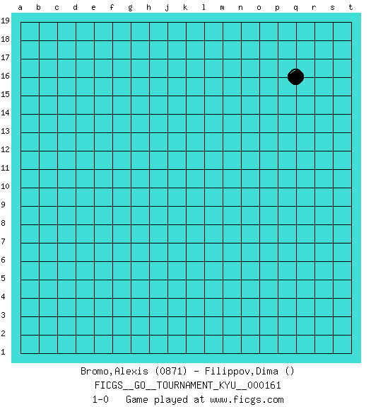 Last move : 1-0 2015 April 13 18:39:12 [Event "FICGS__GO__TOURNAMENT_KYU__000161"] [Site "FICGS"] [Date "2015.03.12"] [Round "1"] [Black "Bromo,Alexis"] [White "Filippov,Dima"] [Result "1-0"] [Rating 1 "0871"] 1.q16 1-0 This go game has been lost on time (started : 2015.03.12 15:50:4) Here are the names of the openings (joseki) played in the four corners : Player Black won this Go (weiqi, baduk) game. Follow this game move after move (download)Don't make territory near thickness. (Anonymous) If you are going through hell, keep going. (Winston Churchill)