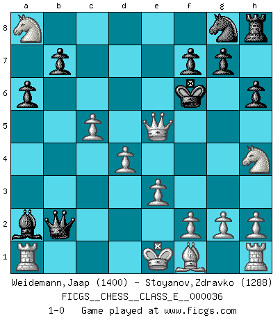 Last move : 1-0 2007 May 3 18:12:40 [Event "FICGS__CHESS__CLASS_E__000036"] [Site "FICGS"] [Date "2007.03.03"] [Round "1"] [White "Weidemann,Jaap"] [Black "Stoyanov,Zdravko"] [Result "1-0"] [WhiteElo "1400"] [BlackElo "1288"] 1.c4 e5 2.Nc3 a6 3.Nf3 Bc5 4.Nxe5 Qf6 5.d4 Bd6 6.Nf3 h6 7.c5 Bf4 8.Bxf4 Qxf4 9.Nd5 Qe4 10.Nxc7 Kd8 11.Nxa8 d6 12.Qb3 Be6 13.Qb6+ Ke7 14.Qxd6+ Kf6 15.Qxb8 Bxa2 16.e3 Qc2 17.Nh4 Qxb2 18.Qe5+ 1-0 English Opening Player White won this chess game. Follow this game move after move (download)For surely of all the drugs in the world, Chess must be the most permanently pleasurable. (Assiac) Schon mancher Spieler hat aufgegeben, um zu vermeiden, daß er eine Figur verliert. (Savielly Grigorievitsch Tartakower) Con el fin de mejorar tu juego, debes de estudiar los finales antes que todo, ya que mientras que los finales pueden ser estudiados y dominados por sí mismos, el juegomedio y la apertura deben de ser estudiados en relación con los finales. (José Raúl Capablanca) Mais n'est-ce pas déjà le limiter injurieusement que d'appeler les échecs un jeu? N'est-ce pas aussi une science, un art, ou quelque chose qui, comme le cercueil de Mahomet entre ciel et terre, est suspendu entre l'un et l'autre, et qui réunit un nombre incroyable de contraires ? (Stefan Zweig) If we knew what we were doing, we would not call it research. (Albert Einstein)