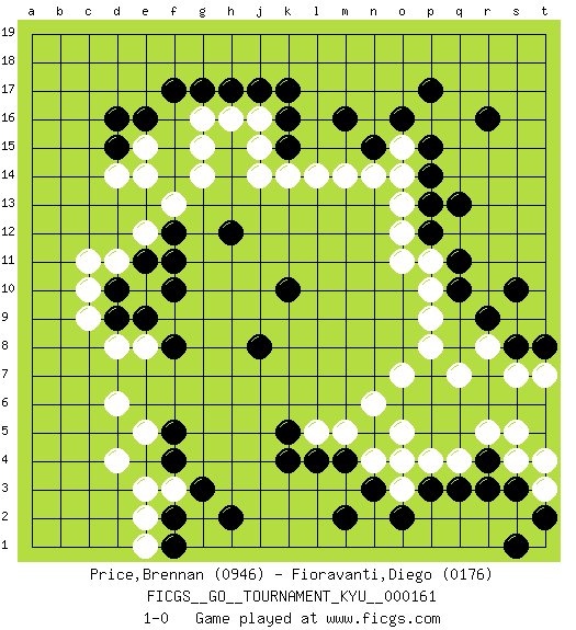 Last move : 1-0 2015 August 12 20:27:55 [Event "FICGS__GO__TOURNAMENT_KYU__000161"] [Site "FICGS"] [Date "2015.03.12"] [Round "1"] [Black "Price,Brennan"] [White "Fioravanti,Diego"] [Result "1-0"] [Rating 1 "0946"] [Rating 2 "0176"] 1.r16 d4 2.d16 p4 3.q10 d11 4.k17 e15 5.d15 e14 6.f17 p8 7.r9 q7 8.k4 l5 9.l4 m5 10.m4 o7 11.k5 p9 12.q13 n6 13.f4 e5 14.f5 d6 15.p17 p10 16.q11 p11 17.p12 o12 18.p14 g15 19.g17 g14 20.e16 j16 21.k16 j15 22.k15 j14 23.r4 o13 24.p13 o11 25.q3 n4 26.n3 q4 27.o4 o5 28.p3 o3 29.o2 o4 30.m2 n14 31.o16 l14 32.j8 m14 33.m16 k14 34.f8 e8 35.e9 d8 36.d9 r5 37.s3 s4 38.r3 s5 39.k10 t3 40.t2 t4 41.s1 r8 42.s8 s7 43.t8 t7 44.s10 d14 45.j17 h16 46.h17 g16 47.f11 e12 48.f12 f13 49.e11 c9 50.d10 c10 51.f10 c11 52.h12 f3 53.g3 e3 54.f2 e2 55.f1 e1 56.h2 o15 57.n15 o14 58.p15 1-0 This go game has been lost on time (started : 2015.03.12 15:50:4) Here are the names of the openings (joseki) played in the four corners : Corner d16 : d16 d11 Hoshi (Hwajeom, Seongjeom, Xingwei`) 4-4 Point. The star or hoshi (4-4) point, emphasizing influence at the potential expense of territory. Corner d4 : d4 f4 Hoshi (Hwajeom, Seongjeom, Xingwei`) 4-4 Point. The star or hoshi (4-4) point, emphasizing influence at the potential expense of territory. Ikken Takagakari (Hankan Nop'dakeolch'im, Yi Gaojia, 1-Space High Approach). White typically responds at 6-4 or 3-10. White 4-10 is played when White finds play on the right side advantageous. White 4-8 or 3-8 may be played when White has support at top. Player Black won this Go (weiqi, baduk) game. Follow this game move after move (download)Don't make dango's. (Anonymous) The real voyage of discovery consists not in seeking new lands but in seeing with new eyes. (Marcel Proust)