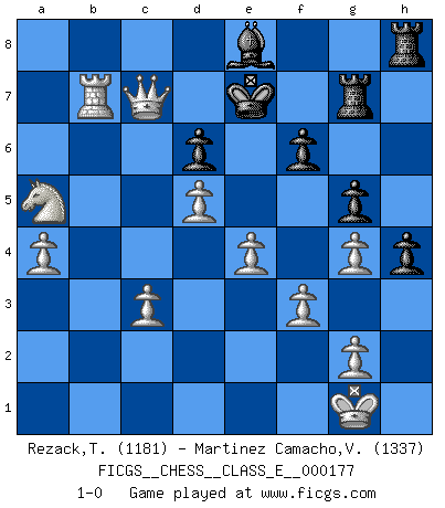 Last move : 1-0 2015 May 15 23:50:33 [Event "FICGS__CHESS__CLASS_E__000177"] [Site "FICGS"] [Date "2015.03.13"] [Round "1"] [White "Rezack,Thomas"] [Black "Martinez Camacho,Victor Hugo"] [Result "1-0"] [WhiteElo "1181"] [BlackElo "1337"] 1.e4 e5 2.Nf3 Nc6 3.d4 exd4 4.Bc4 Bc5 5.c3 d6 6.cxd4 Bb4+ 7.Nc3 Nf6 8.Bg5 h6 9.Bh4 Bg4 10.Qd3 g5 11.Bg3 Nh5 12.O-O Nxg3 13.hxg3 Qd7 14.a3 Bxc3 15.bxc3 O-O-O 16.a4 Na5 17.Nd2 Nxc4 18.Nxc4 Qe7 19.f3 Bd7 20.Na5 h5 21.Rfb1 Rdg8 22.Rxb7 Be8 23.Qa6 Kd7 24.Qxa7 Qd8 25.Rab1 h4 26.g4 f6 27.d5 Rg7 28.Rb8 Qe7 29.R1b7 Qd8 30.Rxd8+ Kxd8 31.Qb8+ Ke7 32.Qxc7+ 1-0 Scotch gambit Kingside Castling by player White (move 12) Queenside Castling by player Black (move 15) Player White won this chess game. Follow this game move after move (download)When asked, -How is that you pick better moves than your opponents?, I responded: I'm very glad you asked me that, because, as it happens, there is a very simple answer. I think up my own moves, and I make my opponent think up his. (Alexander Alekhine) Modernes Schach sorgt sich zuviel um Dinge wie Bauernstruktur usw. Vergessen Sie das, Schachmatt beendet das Spiel! (Nigel Short) Los errores estan ahí, esperando a que se cometan. (Savielly Tartakower) A ce moment-là, je menaçais de comprendre la position ! (Clément L'Heureux) Happy endings are just stories that haven't finished yet. (Jane Smith in Mr & Mrs Smith)