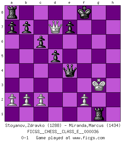 Last move : 0-1 2007 March 27 19:59:16 [Event "FICGS__CHESS__CLASS_E__000036"] [Site "FICGS"] [Date "2007.03.03"] [Round "1"] [White "Stoyanov,Zdravko"] [Black "Miranda,Marcus"] [Result "0-1"] [WhiteElo "1288"] [BlackElo "1434"] 1.e4 c6 2.Nf3 d5 3.e5 g6 4.h3 Bg7 5.d4 f6 6.Bd3 fxe5 7.dxe5 Nd7 8.Qe2 Nh6 9.Bxh6 Bxh6 10.O-O Nc5 11.Rd1 O-O 12.Bc4 Ne6 13.Bd3 Nf4 14.Qf1 Nxh3+ 15.gxh3 Rxf3 16.Nd2 Rxh3 17.Re1 Bxd2 18.Red1 Qf8 19.Rxd2 Qf4 20.Qg2 Qxd2 21.Bxg6 hxg6 22.Qxg6+ Kf8 23.e6 Bxe6 24.Qxe6 Qg5+ 25.Kf1 Rh1+ 26.Ke2 Rxa1 27.Qd7 Qe5+ 28.Kf3 Qe4+ 29.Kg3 Rg1+ 0-1 Caro-Kann defense Kingside Castling by player White (move 10) Kingside Castling by player Black (move 11) Player Black won this chess game. Follow this game move after move (download)The most powerful weapon in Chess is to have the next move. (David Bronstein) Ich bin es gewohnt, das die Jugend mir überhaupt keinen Respekt entgegenbringt. (Alexander Morozewich) El Ajedrez te enseña a controlarl la excitación inicial que sientes cuando vez algo que parece bueno y te enseña a pensar objetivamente cuando te encuentras en problemas. (Stanley Kubrick) Même si vous avez un bon coup à faire, regardez toujours s'il n'y en a pas un qui lui soit préférable. (Pedro Damiano) If only people were all showed a certain minimum level of niceness; if only people didn't retract verbal draw offers (without draw box ticked) on ficgs; if only people didn't kill; if only people didn't run concentration / extermination camps, if only people didn't drop nuclear bombs on Hiroshima and Nagasaki, and so on - it would be a much more beautiful world. But sadly, things are not so... (Normajean Yates)
