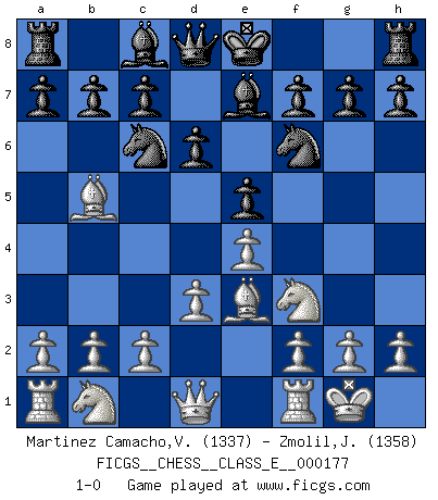 Last move : 1-0 2015 May 10 9:45:30 [Event "FICGS__CHESS__CLASS_E__000177"] [Site "FICGS"] [Date "2015.03.13"] [Round "1"] [White "Martinez Camacho,Victor Hugo"] [Black "Zmolil,Josef"] [Result "1-0"] [WhiteElo "1337"] [BlackElo "1358"] 1.e4 e5 2.Nf3 Nc6 3.Bb5 Nf6 4.d3 d6 5.O-O Be7 6.Be3 1-0 This chess game has been lost on time (started : 2015.03.13 1:10:13) Ruy Lopez : Berlin defense Kingside Castling by player White (move 5) Player White won this chess game. Follow this game move after move (download)A thorough understanding of the typical mating continuations makes the most complicated sacrificial combinations leading up to them not only not difficult, but almost a matter of course. (Siegbert Tarrasch) Fallen sollten polizeilich verboten werden. (Savielly Grigorievitsch Tartakower) El Ajedrez es un mar en el cual un mosquito puede beber y un elefante puede bañarse. (Refrán Hindú) Ne tendez aucun piège pour le plaisir ! Ne jouez rien dans l'espoir que l'adversaire réagisse de façon stupide ! Prenez toujours pour acquis que l'adversaire va trouver le meilleur coup ! Ne jouez jamais de coup dans l'espoir que l'adversaire ne voie pas la menace ! Chacun de vos coups doit améliorer la position d'une façon ou d'une autre. Even the best needles are not sharp at both ends. (Chinese proverb)
