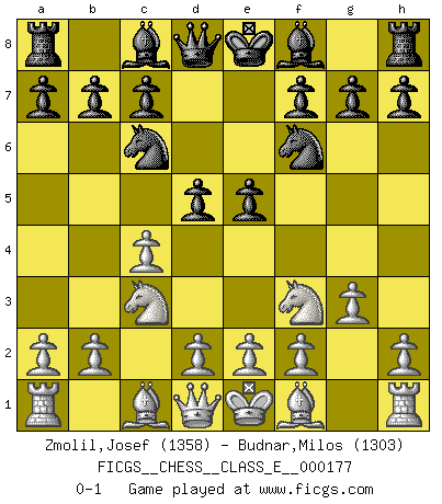 Last move : 0-1 2015 May 9 1:58:30 [Event "FICGS__CHESS__CLASS_E__000177"] [Site "FICGS"] [Date "2015.03.13"] [Round "1"] [White "Zmolil,Josef"] [Black "Budnar,Milos"] [Result "0-1"] [WhiteElo "1358"] [BlackElo "1303"] 1.c4 Nf6 2.Nc3 e5 3.Nf3 Nc6 4.g3 d5 0-1 This chess game has been lost on time (started : 2015.03.13 1:10:13) English Opening Player Black won this chess game. Follow this game move after move (download)Chess, like love, like music, has the power to make people happy. (Siegbert Tarrasch) Ein Springer auf f6 gegen die eigene Rochadestellung ist schlimmer als ein rostiger Nagel im Knie. (Efim Bogoljubov) Si el ingenio solamente fuese necesario para lucirse, las mujeres serían las mejores jugadoras de Ajedrez del mundo. (Albin) Les échecs, c'est l'imagination. (David Bronstein) All politicians must be presumed guilty until they are proven innocent. (Dinesh De Silva)