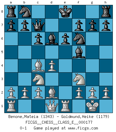 Last move : 0-1 2015 May 17 9:42:13 [Event "FICGS__CHESS__CLASS_E__000177"] [Site "FICGS"] [Date "2015.03.13"] [Round "1"] [White "Benone,Mateia"] [Black "Goldmund,Heike"] [Result "0-1"] [WhiteElo "1343"] [BlackElo "1179"] 1.e4 d5 2.exd5 Qxd5 3.Nc3 Qa5 4.d4 Nf6 5.Bd2 c6 6.Nf3 Qc7 7.Bc4 Bf5 8.O-O e6 9.Re1 Bd6 0-1 Scandinavian (centre counter) defense Kingside Castling by player White (move 8) Player Black won this chess game. Follow this game move after move (download)When you play Bobby, it is not a question if you win or lose. It is a question if you survive. (Boris Spassky) Später, ... hatte ich zunehmend Erfolg in entscheidenden Partien. Vielleicht weil ich eine einfache Wahrheit erkannte: nicht nur ich hatte Angst, auch mein Gegner. (Mikhail Nekhemyevich Tal) En el Ajedrez, tal como en la vida, las bendiciones de hoy pueden ser el veneno del mañana. (Assaic) Si le désir cupide (et stupide) de gagner est une inépuisable source de souffrance, une combinaison brillante sur l'échiquier est une découverte : le coquelicot qui s'épanouit lorsque apparaît la Voie Lactée. (Arrabal) History is a gallery of pictures in which there are few originals and many copies. (Alexis de Tocqueville)