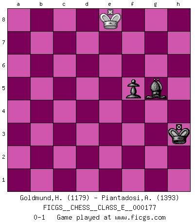 Last move : 0-1 2015 August 17 22:17:53 [Event "FICGS__CHESS__CLASS_E__000177"] [Site "FICGS"] [Date "2015.03.13"] [Round "1"] [White "Goldmund,Heike"] [Black "Piantadosi,Angelo"] [Result "0-1"] [WhiteElo "1179"] [BlackElo "1393"] 1.b4 e5 2.Bb2 Bxb4 3.Bxe5 Nf6 4.a3 Ba5 5.c4 d6 6.Bb2 O-O 7.e3 Nc6 8.Nf3 Bg4 9.Be2 Re8 10.O-O Ne5 11.Nxe5 Bxe2 12.Qxe2 dxe5 13.d3 c5 14.Nd2 Bc7 15.Nf3 e4 16.dxe4 Nxe4 17.Rfd1 Qe7 18.Rd5 Rad8 19.Rad1 Nf6 20.Bxf6 Qxf6 21.Rxc5 Rxd1+ 22.Qxd1 Rd8 23.Qb1 Bb6 24.Rd5 Rxd5 25.cxd5 g6 26.e4 Qf4 27.Qc2 Qf6 28.Kf1 Qa1+ 29.Ke2 Qxa3 30.Ne5 Qd6 31.Qc3 Bc7 32.Nf3 Qf4 33.Qd3 Qc1 34.d6 Bd8 35.g3 Qb2+ 36.Nd2 Qe5 37.Nc4 Qc5 38.d7 Kf8 39.Nd6 Qc6 40.Nc8 a6 41.Qd6+ Qxd6 42.Nxd6 Ke7 43.Nxb7 Kxd7 44.Nc5+ Kc6 45.Nxa6 Be7 46.Kd3 Kb7 47.f4 Kxa6 48.Kc4 Kb6 49.f5 Kc6 50.g4 Kd6 51.Kd4 Bf6+ 52.Kd3 Ke5 53.h3 Bg5 54.Kc4 Kxe4 55.fxg6 hxg6 56.Kc5 Kf3 57.Kd6 Kg3 58.Kd7 Kxh3 59.Ke8 f5 60.gxf5 gxf5 0-1 Polish (Sokolsky) opening Kingside Castling by player Black (move 6) Kingside Castling by player White (move 10) 10 pieces endgame at move 47 : White KPPPP , Black KBPPP WHITE : King + 4 Pawns BLACK : King + 1 Bishop 3 Pawns 9 pieces endgame at move 54 : White KPPP , Black KBPPP WHITE : King + 3 Pawns BLACK : King + 1 Bishop 3 Pawns 8 pieces endgame at move 55 : White KPPP , Black KBPP WHITE : King + 3 Pawns BLACK : King + 1 Bishop 2 Pawns 7 pieces endgame at move 55 : White KPP , Black KBPP WHITE : King + 2 Pawns BLACK : King + 1 Bishop 2 Pawns 6 pieces endgame at move 58 : White KP , Black KBPP WHITE : King + 1 Pawn BLACK : King + 1 Bishop 2 Pawns 5 pieces endgame at move 60 : White KP , Black KBP WHITE : King + 1 Pawn BLACK : King + 1 Bishop 1 Pawn 4 pieces endgame at move 60 : White K , Black KBP WHITE : King + BLACK : King + 1 Bishop 1 Pawn Player Black won this chess game. Follow this game move after move (download)Openings teach you openings. Endgames teach you chess ! (Stephan Gerzadowicz) Ein Teil des Fehlers ist immer korrekt. (Savielly Grigorievitsch Tartakower) Yo no creo en la psicología. Yo creo en las buenas movidas. (Bobby Fischer) La victoire dans une partie d'Echecs appartient la plupart du temps à celui qui voit un peu plus loin que l'adversaire. (Lasker) The only thing that overcomes hard luck is hard work. (Harry Golden)