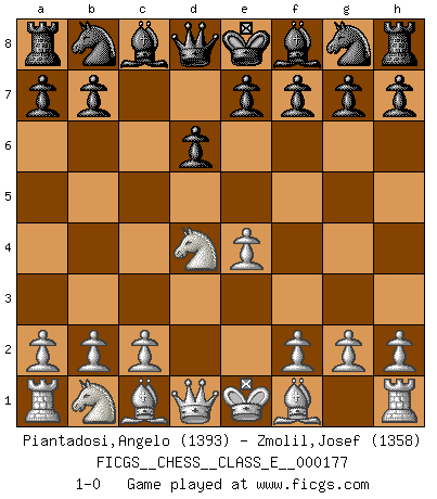 Last move : 1-0 2015 May 9 9:39:22 [Event "FICGS__CHESS__CLASS_E__000177"] [Site "FICGS"] [Date "2015.03.13"] [Round "1"] [White "Piantadosi,Angelo"] [Black "Zmolil,Josef"] [Result "1-0"] [WhiteElo "1393"] [BlackElo "1358"] 1.e4 c5 2.Nf3 d6 3.d4 cxd4 4.Nxd4 1-0 This chess game has been lost on time (started : 2015.03.13 1:10:13) Sicilian Player White won this chess game. Follow this game move after move (download)Not all artists are Chess players, but all Chess players are artists. (Marcel Duchamp) Ich rechne überhaupt nicht voraus. Ich gewinne auch so. (Robert James Fischer) Te sientas frente a un tablero y repentinamente tu corazón brinca. Tu mano tiembla al tomar una pieza y moverla. Pero lo que el Ajedrez te enseña es que tu debes permanecer ahí con calma y pensar de que si realmente es una buena idea o de que si hay otras ideas mejores. (Stanley Kubrick) Aidez vos pièces, elles vous aideront. (Paul Morphy) Somewhere in the world there is an epigram for every dilemma. (Hendrik Willem van Loon)
