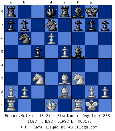 Last move : 0-1 2015 June 18 13:28:40 [Event "FICGS__CHESS__CLASS_E__000177"] [Site "FICGS"] [Date "2015.03.13"] [Round "1"] [White "Benone,Mateia"] [Black "Piantadosi,Angelo"] [Result "0-1"] [WhiteElo "1343"] [BlackElo "1393"] 1.e4 Nf6 2.e5 Nd5 3.d4 d6 4.c4 Nb6 5.f4 dxe5 6.fxe5 Bf5 7.Nc3 e6 8.Nf3 Be7 9.Be3 O-O 10.Be2 N8d7 11.O-O c5 12.d5 exd5 13.cxd5 Re8 14.d6 Bf8 0-1 This chess game has been lost on time (started : 2015.03.13 1:10:13) Alekhine's defense : Four pawns attack Kingside Castling by player Black (move 9) Kingside Castling by player White (move 11) Player Black won this chess game. Follow this game move after move (download)If I win a tournament, I win it by myself. I do the playing. Nobody helps me. (Bobby Fischer) Alle offensichtlichen Züge sehen nach dem Spiel in der Analyse verdächtig aus. (Viktor Kortschnoi) Yo adoro todas la posiciones. Denme una partida posicional difícil, y la jugaré. Pero posiciones totalmente ganadas, no las tolero. (Hein Donner) A ce moment-là, je menaçais de comprendre la position ! (Clément L'Heureux) All men can see these tactics whereby I conquer, but what none can see is the strategy out of which victory is evolved. (Sun Tzu)