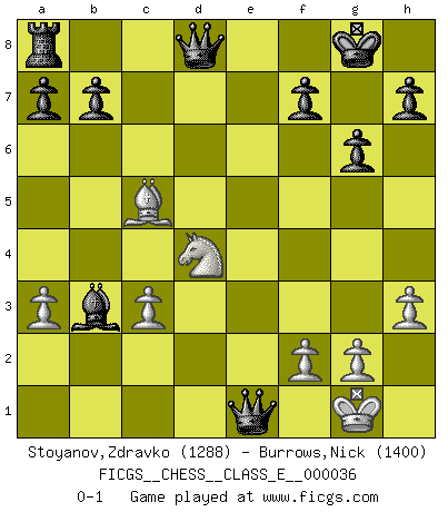 Last move : 0-1 2007 March 21 21:41:40 [Event "FICGS__CHESS__CLASS_E__000036"] [Site "FICGS"] [Date "2007.03.03"] [Round "1"] [White "Stoyanov,Zdravko"] [Black "Burrows,Nick"] [Result "0-1"] [WhiteElo "1288"] [BlackElo "1400"] 1.e4 g6 2.Nf3 Bg7 3.Bc4 d6 4.h3 Nf6 5.c3 Nxe4 6.O-O O-O 7.Bd5 Nf6 8.Bc4 e5 9.Ng5 d5 10.d4 dxc4 11.Re1 exd4 12.cxd4 Nc6 13.Be3 Nd5 14.Nf3 Ndb4 15.Nc3 Be6 16.a3 Nd3 17.Re2 Re8 18.Ne1 Nxd4 19.Nxd3 Nxe2+ 20.Qxe2 cxd3 21.Qd2 Bb3 22.Nb5 c5 23.Bxc5 Re2 24.Qc3 Bxc3 25.bxc3 d2 26.Nd4 Re1+ 27.Rxe1 dxe1Q+ 0-1 Robatsch (Modern) defense Kingside Castling by player White (move 6) Kingside Castling by player Black (move 6) Promotion Queen by player Black (move 27) Player Black won this chess game. Follow this game move after move (download)First-class players lose to second class players because second-class players sometimes play a first-class game. (Tarrasch) Wenn man heute mit 14 Jahren noch kein GM ist, kann man es vergessen. (Viswanathan Anand) A través de las casillas del tablero, los Indios explican el movimiento del tiempo y la edad, las influencias mas altas que controlan el mundo y los lazos que vinculan al Ajedrez con el alma humana. (Al-Masudi) Nous vivons dans un monde échiquéen : chaque jour qui passe est un défi à relever. (Philosophe Sasha) I take risks, sometimes patients die, but not taking risks causes more patients to die. So I guess my biggest problem is I've been cursed with the ability to do the math. (Gregory House, House M.D.)