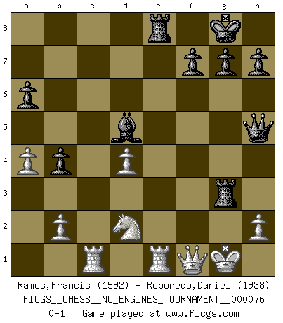 Last move : 0-1 2015 April 22 17:21:17 [Event "FICGS__CHESS__NO_ENGINES_TOURNAMENT__000076"] [Site "FICGS"] [Date "2015.03.13"] [Round "1"] [White "Ramos,Francis"] [Black "Reboredo,Daniel"] [Result "0-1"] [WhiteElo "1592"] [BlackElo "1938"] 1.e4 e5 2.Nf3 Nc6 3.Bb5 a6 4.Ba4 Nf6 5.O-O Be7 6.Re1 b5 7.Bb3 O-O 8.c3 d5 9.exd5 Nxd5 10.Nxe5 Nxe5 11.Rxe5 c6 12.d4 Bd6 13.Re1 Qh4 14.g3 Qh3 15.Be3 Bg4 16.Qd3 Rae8 17.Nd2 Re6 18.Qf1 Qh5 19.Qg2 Rfe8 20.Bxd5 cxd5 21.a4 Bh3 22.Qf3 Bg4 23.Qg2 b4 24.c4 dxc4 25.Nxc4 Bf3 26.Qf1 Bd5 27.Nd2 Bxg3 28.fxg3 Rxe3 29.Rac1 Rxg3+ 0-1 Ruy Lopez : Closed, 7...O-O Kingside Castling by player White (move 5) Kingside Castling by player Black (move 7) Player Black won this chess game. Follow this game move after move (download)If your opponent cannot do anything active, then don't rush the position; instead you should let him sit there, suffer, and beg you for a draw. (Jeremy Silman) Er war ein guter Schachspieler, aber ich kann Leute nicht ausstehen, die 'Heil Hitler' rufen (Über Alexander Aljechin). (Miguel Najdorf) No hay un Gran Maestro de Ajedrez que sea normal; solo se diferencían ellos por la magnitud de su locura. (Viktor Korchnoi) Toutes les manuvres exécutées sur une colonne ouverte ont pour but ultime l'intrusion définitive sur la septième ou la huitième rangée, en plein cur de la position ennemie. (Aaron Nimzovitch) The next best thing to gambling and winning is gambling and loosing. (Nick Dandalos)