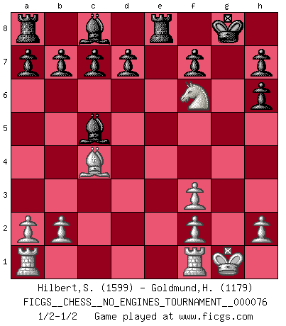 Last move : 1/2-1/2 2015 May 13 21:10:6 [Event "FICGS__CHESS__NO_ENGINES_TOURNAMENT__000076"] [Site "FICGS"] [Date "2015.03.13"] [Round "1"] [White "Hilbert,Stephan J."] [Black "Goldmund,Heike"] [Result "1/2-1/2"] [WhiteElo "1599"] [BlackElo "1179"] 1.e4 e5 2.Nf3 Nc6 3.d4 exd4 4.c3 dxc3 5.Bc4 Bc5 6.Ng5 Nh6 7.Qf3 O-O 8.Nxc3 Nd4 9.Qd3 Qf6 10.O-O Re8 11.Nd5 Qe5 12.Nf3 Nxf3+ 13.Qxf3 Qxe4 14.Bxh6 Qxf3 15.gxf3 gxh6 16.Nf6+ 1/2-1/2 Scotch : Goering gambit Kingside Castling by player Black (move 7) Kingside Castling by player White (move 10) This chess game ended in a draw. Follow this game move after move (download)Only the player with the initiative has the right to attack. (Wilhelm Steinitz) Es ist im Leben wie im Schachspiel. Wir entwerfen einen Plan, dieser bleibt jedoch bedingt durch das, was im Schachspiel dem Gegner, im Leben dem Schicksal zu tun belieben wird. (Arthur Schopenhauer) No volvere nunca a jugar contigo. Has insultado a mi amigo. - cuando un oponente se maldijo por una mala jugada (Miguel Najdorf) Les Echecs ont trois composantes : le temps, l'espace et le matériel en dernier. (Mikhail Tal) Have no fear of perfection - you'll never reach it. (Salvador Dali)