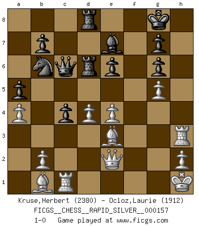 Last move : 1-0 2015 March 21 2:28:45 [Event "FICGS__CHESS__RAPID_SILVER__000157"] [Site "FICGS"] [Date "2015.03.14"] [Round "1"] [White "Kruse,Herbert"] [Black "Ocloz,Laurie"] [Result "1-0"] [WhiteElo "2380"] [BlackElo "1912"] 1.d4 Nf6 2.c4 c6 3.Nc3 d5 4.Nf3 dxc4 5.a4 Bf5 6.e3 e6 7.Bxc4 Bb4 8.O-O Nbd7 9.Nh4 O-O 10.f3 Bg6 11.Kh1 Qa5 12.Na2 Be7 13.Nxg6 hxg6 14.Bd2 Qc7 15.Rc1 Bd6 16.f4 a5 17.g4 Nb6 18.Bd3 Nfd5 19.Rf3 Nb4 20.Bb1 Nxa2 21.Bxa2 Bb4 22.e4 c5 23.f5 c4 24.Be3 Qc6 25.Bb1 Be7 26.Rh3 Rad8 27.Qf1 Rd6 28.Qe2 Rfd8 29.fxg6 fxg6 30.g5 1-0 Queen's pawn game Kingside Castling by player White (move 8) Kingside Castling by player Black (move 9) Player White won this chess game. Follow this game move after move (download)You cannot play at Chess if you are kind-hearted. (French Proverb) Ein Springer auf f6 gegen die eigene Rochadestellung ist schlimmer als ein rostiger Nagel im Knie. (Efim Bogoljubov) Creo que una cierta cantidad de temperamento es esperada de los genios del Ajedrez. (Ron Gross) Le moment que je préfère le plus dans une rencontre, c'est celui où je sens que la personnalité de l'adversaire se brise. (Robert Fischer) Indecision is the key to flexibility. (Unknown)