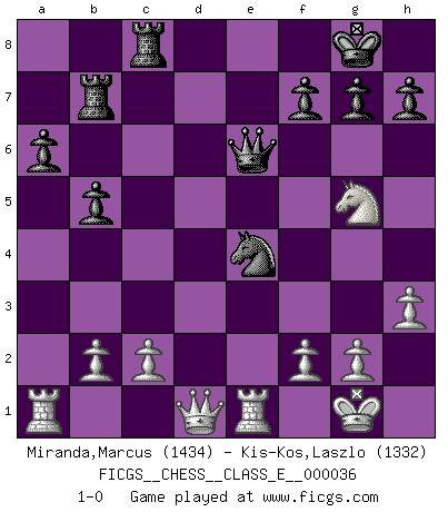 Last move : 1-0 2007 April 5 10:17:33 [Event "FICGS__CHESS__CLASS_E__000036"] [Site "FICGS"] [Date "2007.03.03"] [Round "1"] [White "Miranda,Marcus"] [Black "Kis-Kos,Laszlo"] [Result "1-0"] [WhiteElo "1434"] [BlackElo "1332"] 1.e4 e5 2.Nf3 Nc6 3.Bb5 a6 4.Ba4 Nf6 5.O-O Be7 6.Re1 b5 7.Bb3 O-O 8.h3 d6 9.d3 Na5 10.Bd2 Nxb3 11.axb3 c5 12.Ba5 Qd7 13.b4 cxb4 14.Bxb4 Bb7 15.Nbd2 Rfe8 16.Nb3 Rac8 17.Na5 d5 18.Nxe5 Qe6 19.Bxe7 Rxe7 20.Nf3 dxe4 21.Nxb7 Rxb7 22.dxe4 Nxe4 23.Ng5 1-0 Ruy Lopez : Closed, 7...O-O Kingside Castling by player White (move 5) Kingside Castling by player Black (move 7) Player White won this chess game. Follow this game move after move (download)Botvinnik tried to take the mystery out of Chess, always relating it to situations in ordinary life. He used to call Chess a typical inexact problem similar to those which people are always having to solve in everyday life. (Garry Kasparov) Im Fernschach kannst du während dem Spiel rauchen. (John Christen Knudsen) El arma más poderosa en el Ajedrez, es tener la próxima movida. (David Bronstein) Avant la finale, les dieux ont créé le milieu de partie. (Tarrasch) A good book on your shelf is a friend that turns its back on you and remains a friend. (Author unknown)