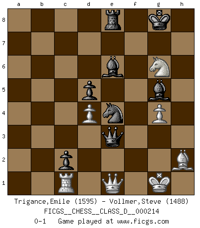 Last move : 0-1 2015 March 25 15:56:51 [Event "FICGS__CHESS__CLASS_D__000214"] [Site "FICGS"] [Date "2015.03.14"] [Round "1"] [White "Trigance,Emile"] [Black "Vollmer,Steve"] [Result "0-1"] [WhiteElo "1595"] [BlackElo "1488"] 1.e4 c5 2.c3 Nc6 3.d4 cxd4 4.cxd4 d6 5.Bc4 Nf6 6.Nc3 e6 7.Nf3 Nxe4 8.Nxe4 d5 9.Bxd5 exd5 10.Nc3 Be7 11.h3 O-O 12.O-O Be6 13.Bf4 Rc8 14.Re1 h6 15.Qd2 Bf6 16.Ne5 Re8 17.Rad1 Ne7 18.Bh2 Nf5 19.f4 Nd6 20.Qf2 b5 21.a3 a5 22.Rc1 b4 23.axb4 axb4 24.Nb1 Nc4 25.b3 Nd6 26.Nd2 Qb6 27.Ndf3 Ne4 28.Qe3 Rc3 29.Rxc3 bxc3 30.g4 g5 31.fxg5 hxg5 32.Rc1 Qxb3 33.Qe1 c2 34.h4 gxh4 35.Nxh4 Bg5 36.Nhg6 fxg6 37.Nxg6 Qe3+ 0-1 Sicilian : Alapin's variation (2.c3) Kingside Castling by player Black (move 11) Kingside Castling by player White (move 12) Player Black won this chess game. Follow this game move after move (download)Excellence at Chess is one mark of a scheming mind. (Sir Arthur Conan Doyle) Ein Buch ist ein Spiegel; wenn ein Affe hineinsieht, so kann kein Apostel heraus gucken. (Georg Christoph Lichtenberg) Cuando tengo las piezas blancas, yo gano porque soy blanco; Cuando tengo las piezas negras, yo gano porque soy Bogolyubov. (Bogolyubov) Toutes les manuvres exécutées sur une colonne ouverte ont pour but ultime l'intrusion définitive sur la septième ou la huitième rangée, en plein cur de la position ennemie. (Aaron Nimzovitch) You can't play chess if you're groggy from pills. (Anatoly Karpov)