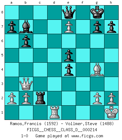 Last move : 1-0 2015 April 21 18:6:41 [Event "FICGS__CHESS__CLASS_D__000214"] [Site "FICGS"] [Date "2015.03.14"] [Round "1"] [White "Ramos,Francis"] [Black "Vollmer,Steve"] [Result "1-0"] [WhiteElo "1592"] [BlackElo "1488"] 1.e4 e6 2.d4 d5 3.Nc3 Nf6 4.e5 Nfd7 5.f4 c5 6.Nf3 Nc6 7.Be3 Be7 8.Be2 b6 9.Qd2 Bb7 10.O-O O-O 11.Qe1 cxd4 12.Nxd4 Bc5 13.Rd1 Qe7 14.Kh1 Rac8 15.Qg3 Nxd4 16.Bxd4 Bxd4 17.Rxd4 Nc5 18.f5 f6 19.Bg4 Ne4 20.Nxe4 dxe4 21.fxe6 fxe5 22.R4d1 Rxc2 23.Rxf8+ Qxf8 24.e7 Qe8 25.Qb3+ 1-0 French : Steinitz, Boleslavsky variation Kingside Castling by player White (move 10) Kingside Castling by player Black (move 10) Player White won this chess game. Follow this game move after move (download)The blunders are all there on the board, waiting to be made. (Savielly Tartakover) Ein Teil des Fehlers ist immer korrekt. (Savielly Grigorievitsch Tartakower) Si el Ajedrez es una ciencia, es la mas inexacta. Si el Ajedrez es un arte, es demasiado inexacto para ser visto como tal. Si el Ajedrez es un deporte, es demasiado esotérico. Si el Ajedrez es un juego, es demasiado exigente para ser solo un juego. Si el Ajedrez es una aventura, es una muy demandante. Si el Ajedrez es una pasión, es una muy gratificante. Si el Ajedrez es la vida, es una muy triste. (Anónimo) Les Echecs représentent une sphère d'idées créatrices basée sur la volonté des deux protagonistes. (Smyslov) A specialist learns more and more about less and less until he knows everything about nothing. (Nicholas Murray Butler)