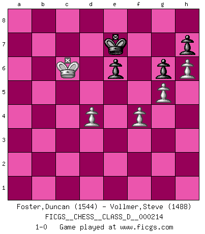 Last move : 1-0 2015 April 16 2:0:3 [Event "FICGS__CHESS__CLASS_D__000214"] [Site "FICGS"] [Date "2015.03.14"] [Round "1"] [White "Foster,Duncan"] [Black "Vollmer,Steve"] [Result "1-0"] [WhiteElo "1544"] [BlackElo "1488"] 1.e4 e6 2.d4 d5 3.e5 c5 4.c3 Ne7 5.Nf3 Ng6 6.Bd3 Nc6 7.h4 cxd4 8.cxd4 Bb4+ 9.Kf1 f6 10.a3 Ba5 11.h5 Nge7 12.Qe2 O-O 13.Nc3 fxe5 14.dxe5 Bxc3 15.bxc3 Qc7 16.Nd4 Qxe5 17.h6 Qxe2+ 18.Kxe2 Nxd4+ 19.cxd4 g6 20.Be3 Bd7 21.Rhc1 Rac8 22.Rab1 Bc6 23.g4 Kf7 24.Bd2 Ng8 25.g5 Ne7 26.Bb4 Rfe8 27.Bd6 Nf5 28.Be5 Rcd8 29.a4 Nd6 30.a5 Nc4 31.Bxc4 dxc4 32.Rxc4 a6 33.Ke3 Rd5 34.Ra1 Rb5 35.f4 Rd8 36.Bc7 R8d5 37.Bb6 Rb2 38.Rac1 Rdb5 39.Rxc6 bxc6 40.Kd3 Rxb6 41.axb6 Rxb6 42.Kc4 Rb5 43.Re1 Rf5 44.Ra1 a5 45.Rb1 Rb5 46.Rxb5 cxb5+ 47.Kxb5 Ke7 48.Kxa5 Kd7 49.Kb5 Ke7 50.Kc6 1-0 French : Advance variation Kingside Castling by player Black (move 12) 10 pieces endgame at move 47 : White KPPPP , Black KPPPP WHITE : King + 4 Pawns BLACK : King + 4 Pawns 9 pieces endgame at move 48 : White KPPPP , Black KPPP WHITE : King + 4 Pawns BLACK : King + 3 Pawns Player White won this chess game. Follow this game move after move (download)It's just you and your opponent at the board and you're trying to prove something. (Bobby Fischer) Ich rechne überhaupt nicht voraus. Ich gewinne auch so. (Robert James Fischer) El Ajedrez es un terrible juego. Si no controlas el centro, tu oponente tiene una posición mas holgada. Si tienes control del centro, ¡entonces realmente tu tienes algo de que preocuparte!. (Siegbert Tarrasch) Un footballeur joue avec ses pieds, parfois avec sa tête. Un joueur d'échecs ne joue qu'avec sa tête. Et quand il ne joue plus, il meurt. (Jacob Murray) Only sick music makes money today. (Friedrich Nietzsche)