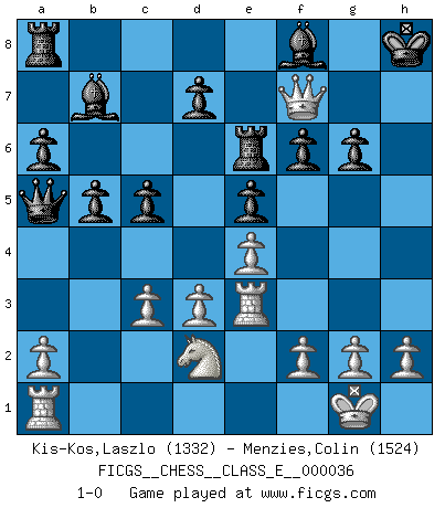 Last move : 1-0 2007 April 4 15:2:18 [Event "FICGS__CHESS__CLASS_E__000036"] [Site "FICGS"] [Date "2007.03.03"] [Round "1"] [White "Kis-Kos,Laszlo"] [Black "Menzies,Colin"] [Result "1-0"] [WhiteElo "1332"] [BlackElo "1524"] 1.e4 e5 2.Nf3 Nc6 3.Bb5 a6 4.Ba4 Nf6 5.O-O b5 6.Bb3 Bc5 7.c3 Na5 8.Bxf7+ Kxf7 9.b4 Bd6 10.bxa5 Re8 11.Re1 Bb7 12.d3 Kg8 13.Bg5 c5 14.Nbd2 Qxa5 15.Qb3+ Kh8 16.Bxf6 gxf6 17.Nh4 Bf8 18.Qf7 Re6 19.Ng6+ hxg6 20.Re3 1-0 Ruy Lopez : 5.O-O Kingside Castling by player White (move 5) Player White won this chess game. Follow this game move after move (download)I don't believe in psychology. I believe in good moves. (Bobby Fischer) Im Spitzenschach von heute geht es nur um Vorbereitung, um tiefgründige, sorgfältige Eröffnungsvorbereitung. (Nigel Short) El Ajedrez es parte de una cultura y si una cultura esta en decadencia, entonces también el Ajedrez declinará. (Mikhail Botvinnik) Seul un grand joueur sait à quel point il joue faiblement. (Xavier Tartacover) All battles are fought by scared men who'd rather be someplace else. (John Wayne in the movie In harm's way)