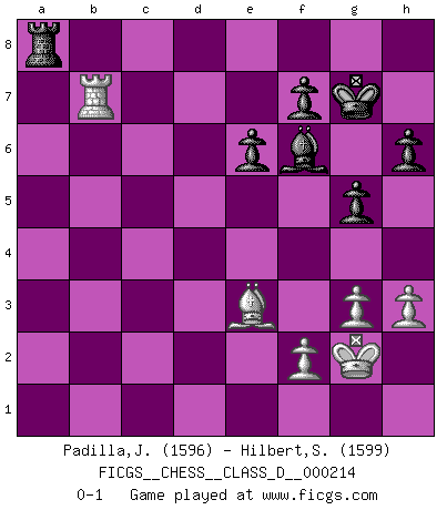Last move : 0-1 2015 December 13 20:54:1 [Event "FICGS__CHESS__CLASS_D__000214"] [Site "FICGS"] [Date "2015.03.14"] [Round "1"] [White "Padilla,Jesus"] [Black "Hilbert,Stephan J."] [Result "0-1"] [WhiteElo "1596"] [BlackElo "1599"] 1.e4 d5 2.exd5 Qxd5 3.Nc3 Qa5 4.d4 Nf6 5.Nf3 Bf5 6.Ne5 c6 7.Bd3 Bxd3 8.Qxd3 Nbd7 9.Nxd7 Nxd7 10.Bd2 e6 11.O-O Qc7 12.Ne4 Be7 13.Qf3 O-O 14.Qg4 Nf6 15.Nxf6+ Bxf6 16.c3 Qb6 17.b3 c5 18.dxc5 Qxc5 19.Rac1 Qa5 20.a4 Qd5 21.Be3 Qxb3 22.Qb4 Qd5 23.Rfd1 Qc6 24.Rd6 Qc7 25.Rcd1 Rad8 26.Bxa7 Rxd6 27.Rxd6 Bxc3 28.Qb6 Qe7 29.Rd3 Qa3 30.g3 Qa1+ 31.Kg2 Bf6 32.Qxb7 Qxa4 33.Be3 Qa8 34.Qxa8 Rxa8 35.Rb3 h6 36.Rb7 g5 37.h3 Kg7 0-1 This chess game has been lost on time (started : 2015.03.14 15:49:27) Scandinavian defense Kingside Castling by player White (move 11) Kingside Castling by player Black (move 13) Player Black won this chess game. Follow this game move after move (download)All I want to do, ever, is just play Chess. (Bobby Fischer) Fischer ist das größte Genie, das je vom Schachhimmel heruntergestiegen ist. (Mikhail Nekhemyevich Tal) El Ajedrez es una manera fabulosa para que los niños aprendan a autovalorarse y a autoestimarse. (Saudin Robovic) Je crois qu'il existe des manières très spécifiques de jouer efficacement contre une machine. Evidemment, nous n'avons aucune chance en technique pure, parce que l'ordinateur calcule de manière parfaite. Mais lorsque nous faisons appel à notre cerveau, en utilisant l'intuition et la compréhension, alors nous restons beaucoup plus forts. (Anatoli Karpov) The production of too many useful things results in too many useless people. (Karl Marx)