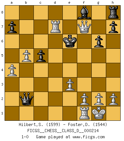 Last move : 1-0 2015 April 2 23:24:14 [Event "FICGS__CHESS__CLASS_D__000214"] [Site "FICGS"] [Date "2015.03.14"] [Round "1"] [White "Hilbert,Stephan J."] [Black "Foster,Duncan"] [Result "1-0"] [WhiteElo "1599"] [BlackElo "1544"] 1.b4 b6 2.Bb2 Bb7 3.e3 d6 4.Nf3 e5 5.Be2 g6 6.d4 Nd7 7.O-O e4 8.Nfd2 Bg7 9.a4 d5 10.c4 c6 11.b5 c5 12.cxd5 Bxd5 13.Nc3 Ndf6 14.dxc5 bxc5 15.Nxd5 Qxd5 16.Nxe4 Qxe4 17.Bf3 Qb4 18.Bxa8 Qxb2 19.Qd6 Nd7 20.Bc6 Ngf6 21.Rad1 Bf8 22.Bxd7+ Kd8 23.Qb8+ Ke7 24.Qc7 Nxd7 25.Rxd7+ Kf6 26.Qf4+ Ke6 27.Qxf7+ 1-0 Polish (Sokolsky) opening Kingside Castling by player White (move 7) Player White won this chess game. Follow this game move after move (download)Of all my Russian books, the defense contains and diffuses the greatest 'warmth' which may seem odd seeing how supremely abstract Chess is supposed to be. (Vladimir Nabokov) Die Fehler sind da, Sie warten nur darauf gemacht zu werden. (Savielly Grigorievitsch Tartakower) La vida es como un juego de Ajedrez, cambiando con cada movimiento. (Proverbio Chino) Les Echecs ne sont pas pour les âmes timides. Ils requièrent un homme entier, qui ne s'arrête pas aveuglément à ce qui a été déjà établi, mais qui tente individuellement de sonder les profondeurs du jeu. (W. Steinitz) Your best chance to get a Royal Flush in a casino is in the bathroom. (Anonymous)