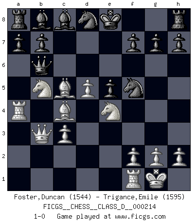 Last move : 1-0 2015 March 19 13:11:57 [Event "FICGS__CHESS__CLASS_D__000214"] [Site "FICGS"] [Date "2015.03.14"] [Round "1"] [White "Foster,Duncan"] [Black "Trigance,Emile"] [Result "1-0"] [WhiteElo "1544"] [BlackElo "1595"] 1.e4 c5 2.a3 Nc6 3.b4 cxb4 4.axb4 Nxb4 5.d4 d5 6.c3 Nc6 7.exd5 Qxd5 8.Na3 e5 9.Nb5 Bd6 10.Bc4 Qe4+ 11.Ne2 Bb8 12.O-O Nge7 13.Ng3 Qh4 14.Ra4 Qg4 15.Qb3 Qg6 16.d5 Nd8 17.Ba3 Qb6 18.Ne4 Nf5 19.Bc5 1-0 Sicilian defense Kingside Castling by player White (move 12) Player White won this chess game. Follow this game move after move (download)Morphy was probably the greatest genius of them all. (Bobby Fischer) Es gibt keine einzige Frau, der ich nicht einen Springer vorgeben könnte und trotzdem gewänne. (Robert James Fischer) Me dio la sensación de como si yo estuviera jugando en contra del mismo Ajedrez. - al estar jugando en contra de Robert Fischer (Walter Shipman) Avec des compensations pour le matériel en plus... (Anonyme) Control your own destiny or someone else will. (Jack Welch)