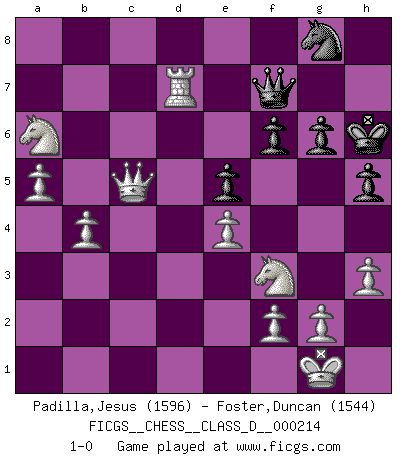 Last move : 1-0 2015 June 7 13:10:46 [Event "FICGS__CHESS__CLASS_D__000214"] [Site "FICGS"] [Date "2015.03.14"] [Round "1"] [White "Padilla,Jesus"] [Black "Foster,Duncan"] [Result "1-0"] [WhiteElo "1596"] [BlackElo "1544"] 1.e4 b6 2.Nc3 Bb7 3.Nf3 d6 4.d4 e6 5.Bd3 h6 6.Be3 g6 7.d5 e5 8.O-O Bg7 9.a4 a6 10.h3 Nd7 11.Re1 Ne7 12.Nh2 O-O 13.Qd2 Kh7 14.Ng4 h5 15.Nh2 Ng8 16.Nf3 f6 17.a5 b5 18.b4 Rf7 19.Ne2 Bh6 20.Bxh6 Nxh6 21.Rac1 c6 22.dxc6 Bxc6 23.c4 Qe7 24.Nc3 bxc4 25.Bxc4 Rg7 26.Bd5 Bxd5 27.Nxd5 Qf8 28.Rc7 Nb8 29.Rxg7+ Qxg7 30.Nb6 Ra7 31.Qxd6 Nd7 32.Nxd7 Ng8 33.Nc5 Qf7 34.Rd1 Kh6 35.Nxa6 Rb7 36.Qc5 Rd7 37.Rxd7 1-0 Owen defense Kingside Castling by player White (move 8) Kingside Castling by player Black (move 12) Player White won this chess game. Follow this game move after move (download)In the perfect Chess combination as in a first-rate short story, the whole plot and counter-plot should lead up to a striking finale, the interest not being allayed until the very last moment. (Yates and Winter) Garry Kasparov war erst in der Großmeister-Organisation GMA, dann in der Profischach-Vereinigung PCA, zum Schluss kehrte er wieder in den Schoß der FIDE zurück. Aber gut, manche Leute sind flexibel (Viswanathan Anand) De todos mis libros Rusos, la defensa contiene y difunde el 'calor' mas grande que pudiese verse extraño al observar lo supremamente abstracto que el Ajedrez supuestamente es. (Vladimir Nabokov) Un journaliste : 'Vous préférez avoir une dame de plus sur l'échiquier ou au lit ?' Boris Spassky : 'Ca dépend de la position.' In theory there is no difference between theory and practice. In practice there is. (Yogi Berra)