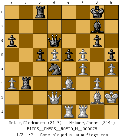Last move : 1/2-1/2 2015 May 1 14:47:34 [Event "FICGS__CHESS__RAPID_M__000078"] [Site "FICGS"] [Date "2015.03.15"] [Round "1"] [White "Ortiz,Clodomiro"] [Black "Helmer,Janos"] [Result "1/2-1/2"] [WhiteElo "2119"] [BlackElo "2144"] 1.c4 c5 2.g3 g6 3.Bg2 Bg7 4.e3 Nc6 5.Ne2 e5 6.Nbc3 Nge7 7.d3 d6 8.a3 Be6 9.Nd5 Rb8 10.Nec3 a6 11.h4 h5 12.Bd2 b5 13.b3 O-O 14.O-O Qd7 15.Kh2 Rfc8 16.Rb1 Qd8 17.e4 Qf8 18.Bg5 f6 19.Be3 Qd8 20.b4 Nd4 21.bxc5 dxc5 22.f4 Nxd5 23.Nxd5 f5 24.Qd2 bxc4 25.dxc4 Qd6 26.Rbe1 Bxd5 27.cxd5 Rb3 28.exf5 1/2-1/2 English : Symmetrical variation Kingside Castling by player Black (move 13) Kingside Castling by player White (move 14) This chess game ended in a draw. Follow this game move after move (download)Chess is not like life... it has rules ! (Mark Pasternak) Wenn Capablanka heute auf der Schachbühne erscheinen würde, hätte er ein halbes Jahr gebraucht um sich die Schachtheorie anzueignen. Und dann hätte er alles und jeden besiegt. (Mikhail Moiseyevich Botvinik) La vida es como un juego de Ajedrez, cambiando con cada movimiento. (Proverbio Chino) Psychologiquement, tu dois avoir confiance en toi même, mais cette confiance doit être basée sur des faits. (Robert Fischer) Ah, beer! The cause of, and the solution to, all of life's problems. (Homer Simpson)