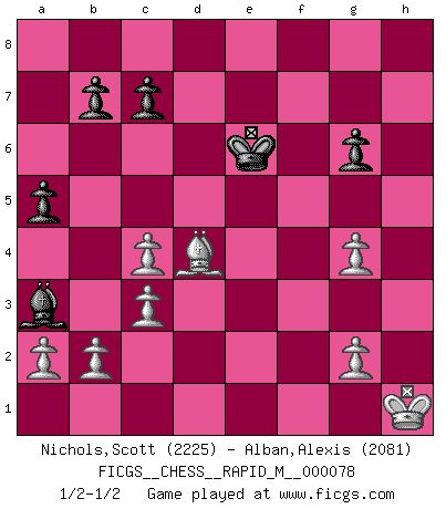 Last move : 1/2-1/2 2015 March 25 13:21:22 [Event "FICGS__CHESS__RAPID_M__000078"] [Site "FICGS"] [Date "2015.03.15"] [Round "1"] [White "Nichols,Scott"] [Black "Alban,Alexis"] [Result "1/2-1/2"] [WhiteElo "2225"] [BlackElo "2081"] 1.e4 e5 2.Nf3 Nc6 3.Bc4 Nf6 4.d3 Bc5 5.c3 d6 6.O-O O-O 7.Bg5 h6 8.Bh4 a6 9.Nbd2 Ba7 10.Bb3 Na5 11.Bc2 g5 12.Nxg5 hxg5 13.Bxg5 Kg7 14.Qf3 Nc6 15.Bd1 Be6 16.Kh1 Rg8 17.Be2 Rc8 18.Rae1 Bc5 19.Bd1 a5 20.Nc4 Bxc4 21.dxc4 Qe7 22.Qg3 Kf8 23.f4 exf4 24.Rxf4 Qe5 25.Bxf6 Rxg3 26.hxg3 Qe6 27.Bg4 Qe8 28.Bf5 Ne5 29.Rh4 Ng6 30.Bxg6 fxg6 31.Rh8+ Kf7 32.Rxe8 Rxe8 33.e5 Re6 34.g4 dxe5 35.Rxe5 Ba3 36.Rxe6 Kxe6 37.Bd4 1/2-1/2 Two knights defense (Modern Bishop's Opening) Kingside Castling by player White (move 6) Kingside Castling by player Black (move 6) This chess game ended in a draw. Follow this game move after move (download)When I asked Fischer why he had not played a certain move in our game, he replied: 'Well, you laughed when I wrote it down !' (Mikhail Tal) Darum geht es im Schach. Einen Tag gibst du deinem Gegner eine Lektion, am nächsten Tag gibt er dir eine. (Robert James Fischer) El juego de Fischer siempre fue nítido, racional y brillante. Uno de los mejores por siempre. (Dave Regis) A chaque perte on perd un peu de soi. (Joël Lautier) After growing wildly for years, the field of computing appears to be reaching its infancy. (John Pierce)
