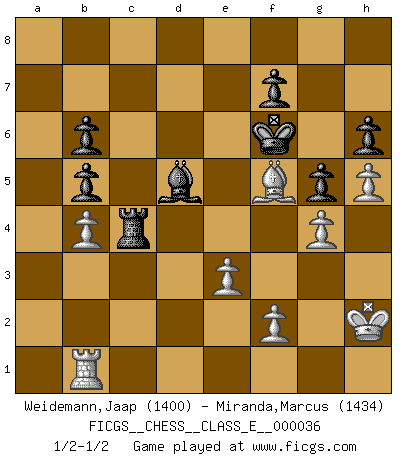 Last move : 1/2-1/2 2007 July 27 0:15:48 [Event "FICGS__CHESS__CLASS_E__000036"] [Site "FICGS"] [Date "2007.03.03"] [Round "1"] [White "Weidemann,Jaap"] [Black "Miranda,Marcus"] [Result "1/2-1/2"] [WhiteElo "1400"] [BlackElo "1434"] 1.c4 e6 2.Nc3 c5 3.Nf3 Nc6 4.d4 d5 5.cxd5 exd5 6.g3 Nf6 7.Bg2 Be7 8.O-O O-O 9.dxc5 Bxc5 10.Bg5 d4 11.Bxf6 Qxf6 12.Nd5 Qd8 13.Nd2 Re8 14.Rc1 Bb6 15.Re1 Bg4 16.Nxb6 axb6 17.h3 Bf5 18.a3 Rc8 19.Nc4 b5 20.Nd2 Be6 21.Rc5 Qb6 22.b4 Qa6 23.Qa1 h6 24.Nf3 b6 25.Rc2 Bc4 26.Rd2 Rcd8 27.Nxd4 Nxd4 28.Rxd4 Rxd4 29.Qxd4 Qxa3 30.Qd7 Re6 31.Qd8+ Kh7 32.Qd2 Qa2 33.Qxa2 Bxa2 34.e3 Rd6 35.Bf3 Rd2 36.h4 g6 37.Re2 Rd1+ 38.Kg2 Bc4 39.Rb2 Rc1 40.h5 g5 41.Be4+ Kg7 42.Rb1 Rc3 43.Bf5 Bd5+ 44.Kh2 Rc4 45.g4 Kf6 1/2-1/2 English Opening Kingside Castling by player White (move 8) Kingside Castling by player Black (move 8) This chess game ended in a draw. Follow this game move after move (download)Chess is not like life... it has rules ! (Mark Pasternak) Weshalb minderdergeübte Spieler mit g2-g4 beginnen? Die betreffenden sind unschlüssig, ob sie nun rechts (h4) oder links (f4) beginnen sollen, und in ihrer Ratlosigkeit entschliessen sie sich nach guter Bürgerart dazu, den goldenen Mittelweg zu wählen. (Aaron Nimzowitsch) El ganador de una partida es aquel jugador que hace el penúltimo error. (Savielly Tartakover) La solitude du joueur d'Echecs à l'approche du mat est semblable à celle du condamné. (Francis Szpiner) The right perception of any matter and a misunderstanding of the same matter do not wholly exclude each other. (Kafka's the trial)