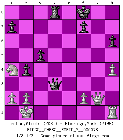 Last move : 1/2-1/2 2015 April 14 23:20:41 [Event "FICGS__CHESS__RAPID_M__000078"] [Site "FICGS"] [Date "2015.03.15"] [Round "1"] [White "Alban,Alexis"] [Black "Eldridge,Mark"] [Result "1/2-1/2"] [WhiteElo "2081"] [BlackElo "2195"] 1.d4 d5 2.c4 c6 3.Nf3 Nf6 4.Nc3 e6 5.Bg5 h6 6.Bh4 dxc4 7.e4 g5 8.Bg3 b5 9.Be2 Bb7 10.h4 g4 11.Ne5 Nbd7 12.Nxg4 b4 13.Nxf6+ Nxf6 14.Na4 Nxe4 15.Be5 Rg8 16.Bxc4 Bd6 17.Qh5 c5 18.d5 Bxd5 19.Bxd5 exd5 20.O-O-O Nf6 21.Bxf6 Qxf6 22.Rxd5 Rxg2 23.Qe2+ Kf8 24.Rxd6 Qxd6 25.Qe4 Rd8 26.Qxg2 Qd2+ 27.Kb1 Qd3+ 1/2-1/2 QGD Slav : 4.Nc3 Queenside Castling by player White (move 20) This chess game ended in a draw. Follow this game move after move (download)No other master has such a terrific will to win. At the board he radiates danger, and even the strongest opponents tend to freeze, like rabbits when they smell a panther. Even his weaknesses are dangerous. As white, his opening game is predictable - you can make plans against it - but so strong that your plans almost never work. In the middle game his precision and invention are fabulous, and in the end game you simply cannot beat him. (Anonymous German Expert) Frage des Reporters: -Welche besonderen Umstände rechtfertigen das Anhalten der Uhren während einer Turnierpartie? Antwort: -Einen Fotographen zu strangulieren. (Siegbert Tarrasch) Cada Peón es una Reina en potencia. (James Mason) Aux échecs, l'amour-propre est satisfait quand on remporte la victoire, mais il n'y a pas de honte à être battu. (Benjamin Franklin) Wisdom is the reward you get for a lifetime of listening when you'd have preferred to talk. (Doug Larson)