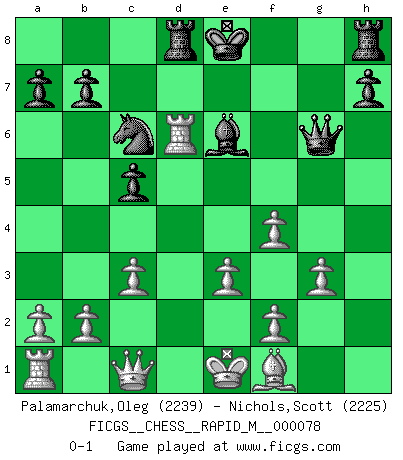 Last move : 0-1 2015 May 25 23:14:44 [Event "FICGS__CHESS__RAPID_M__000078"] [Site "FICGS"] [Date "2015.03.15"] [Round "1"] [White "Palamarchuk,Oleg"] [Black "Nichols,Scott"] [Result "0-1"] [WhiteElo "2239"] [BlackElo "2225"] 1.d4 Nf6 2.Bg5 d5 3.e3 c5 4.Nf3 Ne4 5.Bf4 Qb6 6.Qc1 Nc6 7.c3 f6 8.Nbd2 e5 9.dxe5 g5 10.Bg3 Nxg3 11.hxg3 g4 12.exf6 gxf3 13.gxf3 Ne5 14.Rh5 Qxf6 15.f4 Nc6 16.Rxd5 Be6 17.Ne4 Qg6 18.Nd6+ Bxd6 19.Rxd6 Rd8 0-1 This chess game has been lost on time (started : 2015.03.15 14:20:24) Trompowsky attack (Ruth, Opovcensky Opening) Player Black won this chess game. Follow this game move after move (download)We like to think. (Gary Kasparov) Ich tröste mich mit dem Vergnügen, daß Schachfans, Zuschauer und Leser glücklich sind, wenn ein Großmeister etwas riskiert, statt nur Klötzchen zu schieben. (Mikhail Nekhemyevich Tal) Muchos se han convertido en Maestros de Ajedrez, nadie se ha convertido en el Maestro del Ajedrez. (Siegbert Tarrasch) C'est une question de caractère, Beaucoup de gens perdent leur motivation très vite. D'autres, ils sont rares, peuvent la conserver très longtemps. J'aime les échecs, encore aujourd'hui je suis heureux d'analyser des parties. J'aime toujours gagner, je déteste encore perdre. Bien jouer est important pour mon intégrité intellectuelle et morale. Et puis les échecs vivent en ce moment une période historique grâce à Internet. Ils se développent dans les systèmes éducatifs à travers le monde. Ils sortent de leur ghetto, et c'est mon rôle de mener à bien cette révolution. (Gary Kasparov) The next best thing to gambling and winning is gambling and loosing. (Nick Dandalos)