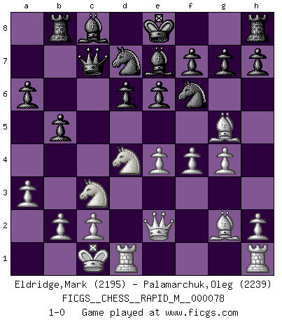 Last move : 1-0 2015 May 23 23:3:44 [Event "FICGS__CHESS__RAPID_M__000078"] [Site "FICGS"] [Date "2015.03.15"] [Round "1"] [White "Eldridge,Mark"] [Black "Palamarchuk,Oleg"] [Result "1-0"] [WhiteElo "2195"] [BlackElo "2239"] 1.e4 c5 2.Nf3 d6 3.d4 cxd4 4.Nxd4 Nf6 5.Nc3 a6 6.Bg5 Nbd7 7.f4 e6 8.Qe2 Qc7 9.O-O-O b5 10.a3 Be7 11.g4 Rb8 12.Bg2 1-0 This chess game has been lost on time (started : 2015.03.15 14:20:24) Sicilian : Najdorf, 6.Bg5 Queenside Castling by player White (move 9) Player White won this chess game. Follow this game move after move (download)I look one move ahead... the best ! (Siegbert Tarrasch) Ich möchte Schüler heranbilden, die das Vermögen haben, selbst zu denken und Kritik zu üben. (Emanuel Lasker) Ciertamente, de todas la drogas del mundo, el Ajedrez debe ser el mas placentero permamentemente. (Assiac) Roi des jeux et jeu des rois, les échecs portent en eux un sentiment d'infini. Ils donnent à celui qui s'est efforcé d'en approfondir les arcanes l'impression de n'être pas à la mesure de l'homme; en fait, ils constituent un résumé de l'univers, un microcosme, et figurent cette grande échelle qui, dans les plans de la lumière descend jusqu'à la matière, qui des abîmes insondables remonte jusqu'en l'infini de Dieu. (Pyrame) Unless I accept my faults I will most certainly doubt my virtues. (Hugh Prather)