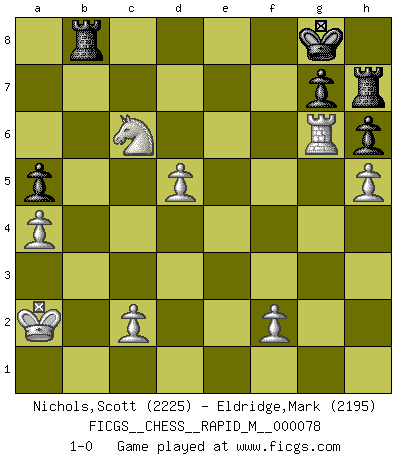 Last move : 1-0 2015 May 8 23:45:10 [Event "FICGS__CHESS__RAPID_M__000078"] [Site "FICGS"] [Date "2015.03.15"] [Round "1"] [White "Nichols,Scott"] [Black "Eldridge,Mark"] [Result "1-0"] [WhiteElo "2225"] [BlackElo "2195"] 1.e4 c5 2.Nf3 d6 3.d4 cxd4 4.Nxd4 Nf6 5.Nc3 a6 6.h3 e6 7.g4 Be7 8.g5 Nfd7 9.Be3 b5 10.a3 Bb7 11.Qd2 Nb6 12.O-O-O N8d7 13.h4 Rc8 14.h5 Ne5 15.Qe1 Qc7 16.Rh3 Nec4 17.g6 Bf6 18.gxf7+ Kxf7 19.Bxc4 Nxc4 20.Rf3 h6 21.Qg1 Qe7 22.Qg2 Kg8 23.Rg1 Rf8 24.Rg3 Rh7 25.Rg6 Kh8 26.Qg3 Qf7 27.Kb1 Qd7 28.Rd1 a5 29.Ndxb5 Bc6 30.a4 Bxb5 31.Nxb5 Bxb2 32.Bd4 Bxd4 33.Rxd4 d5 34.Qc7 Qxc7 35.Nxc7 Ne5 36.exd5 Nf3 37.Nxe6 Rb8+ 38.Ka2 Nxd4 39.Nxd4 Kg8 40.Nc6 1-0 Sicilian : Najdorf, Adams attack Queenside Castling by player White (move 12) Player White won this chess game. Follow this game move after move (download)There must have been a time when men were demigods, or they could not have invented Chess. (Gustav Schenk) Jeder leidlich begabte Spieler, er braucht keineswegs hervorragend veranlagt zu sein, kann es zum Meister bringen. Aber das ist ja auch gar nicht nötig! Der richtige Standpunkt ist es, zu seinem Vergnügen zu spielen, und man glaube ja nicht, dass der Genuss proportional dem Können sei. (Siegbert Tarrasch) Coloca el contenido de las piezas del Ajedrez en un sombrero, agitalo vigorosamente, arrojalas en un tablero desde una altura de 30 centimetros y así obtendras el estilo de Steinitz. (H. E. Bird) Il s'avisa de me proposer d'apprendre les échecs qu'il jouait un peu... me voilà forcené des échecs. J'achète un échiquier, je m'enferme dans ma chambre, j'y passe des jours et des nuits à vouloir apprendre par cur toutes les parties. (Jean-Jacques Rousseau, Confessions) The only difference between a tax man and a taxidermist is that the taxidermist leaves the skin. (Mark Twain)